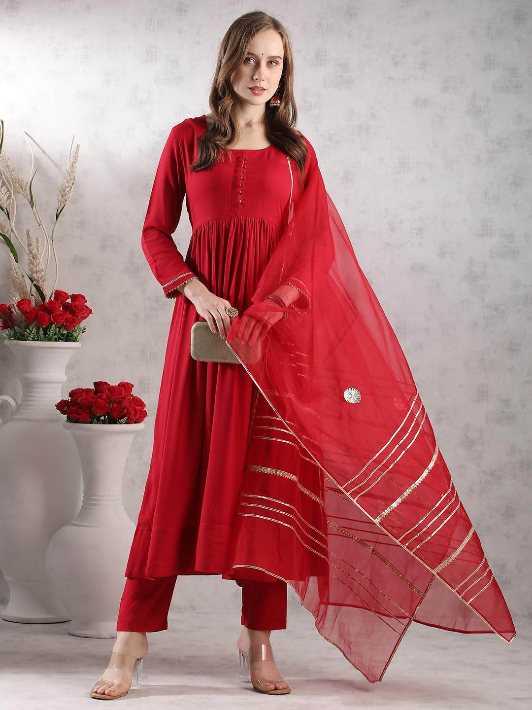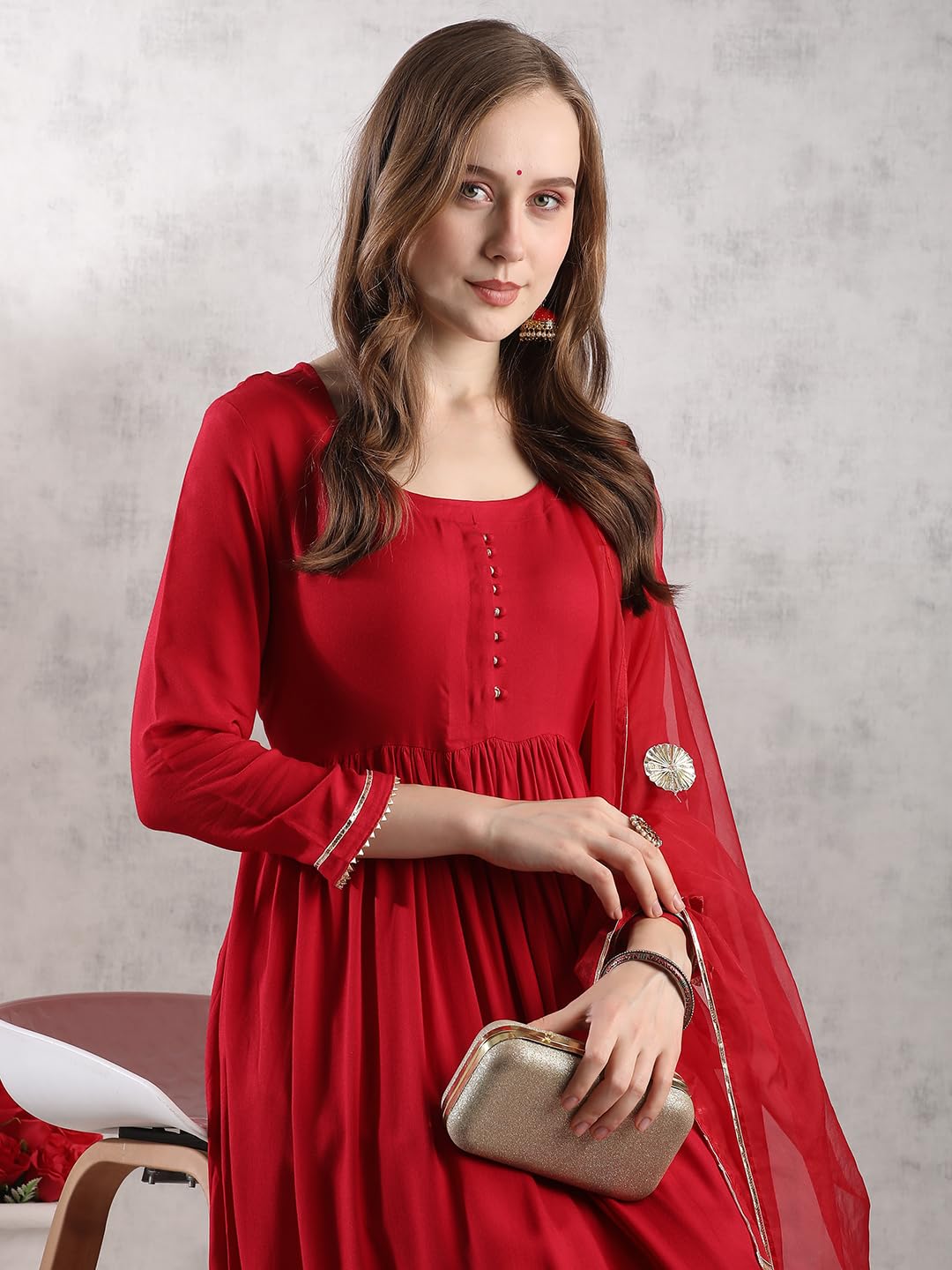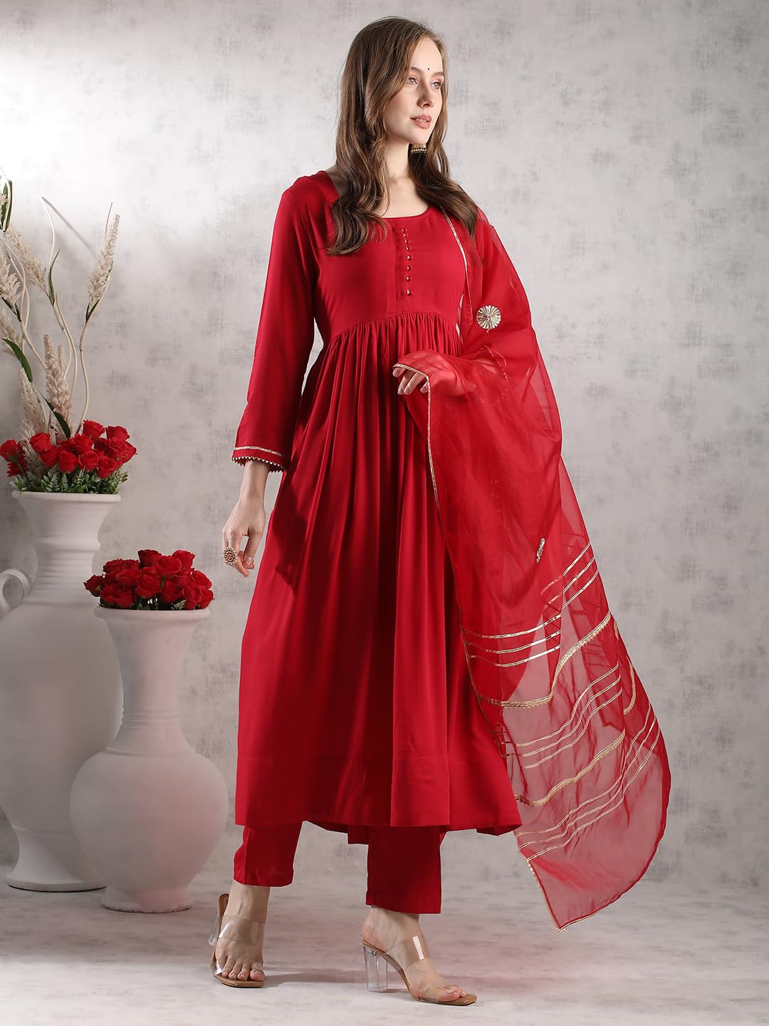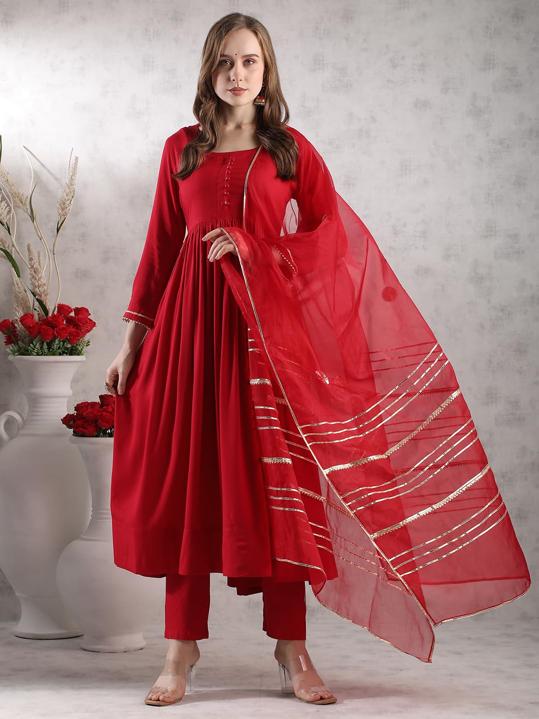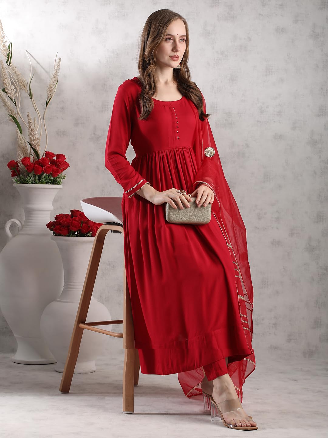 GoSriKi Women’s Rayon Blend Anarkali Solid Kurta with Pant & Dupatta