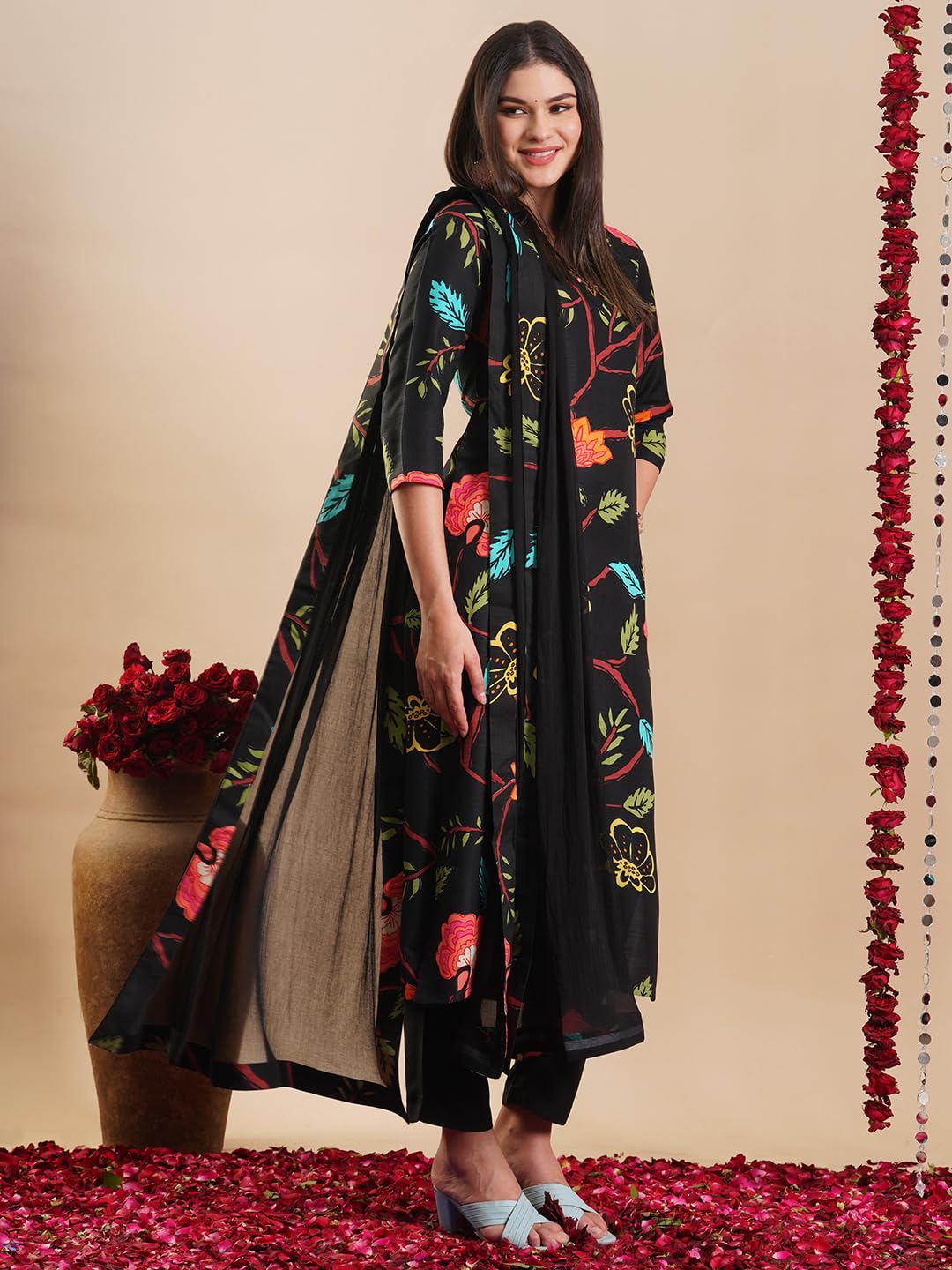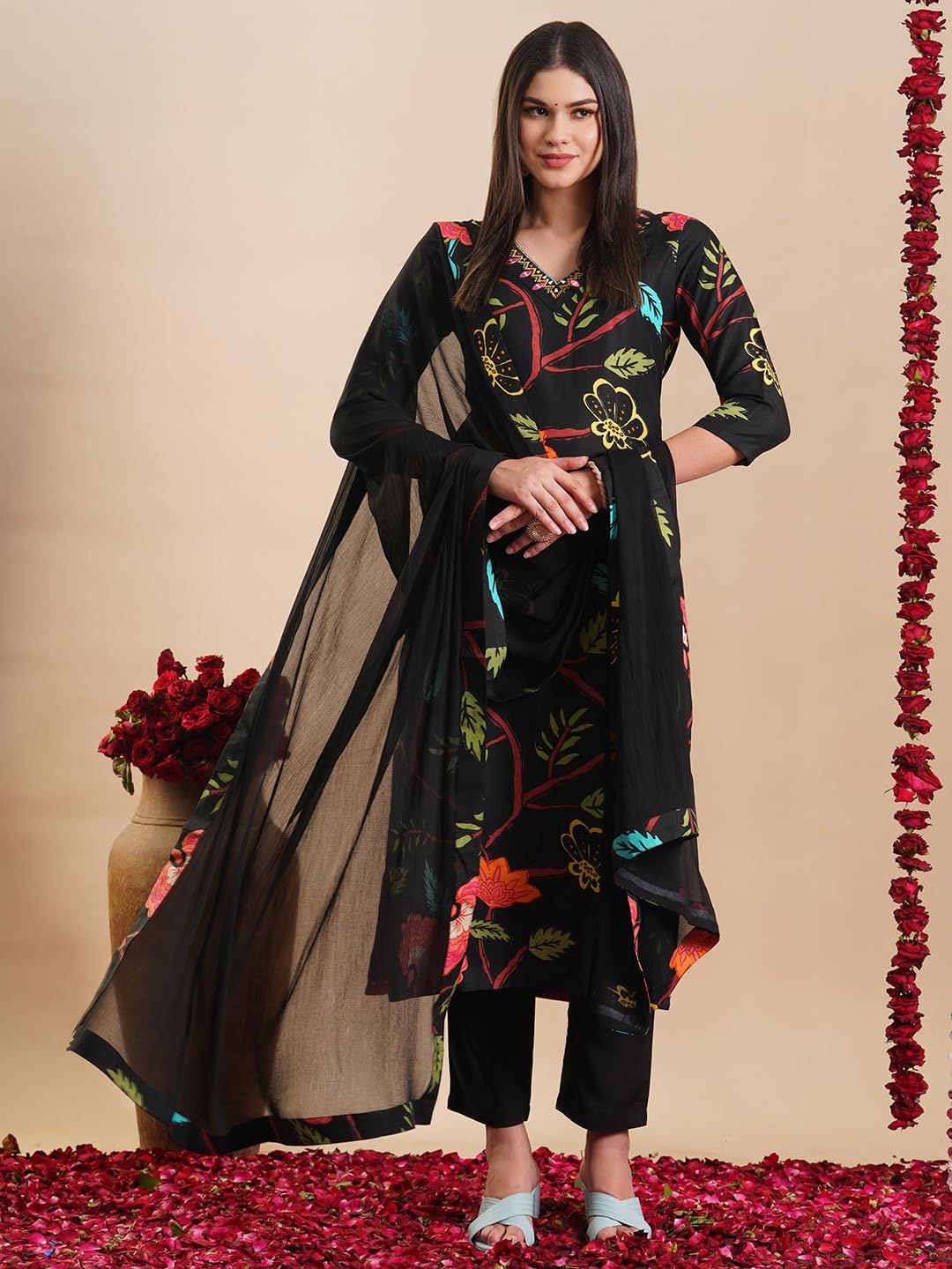 GoSriKi Women’s Rayon Blend Straight Printed Kurta with Pant & Dupatta