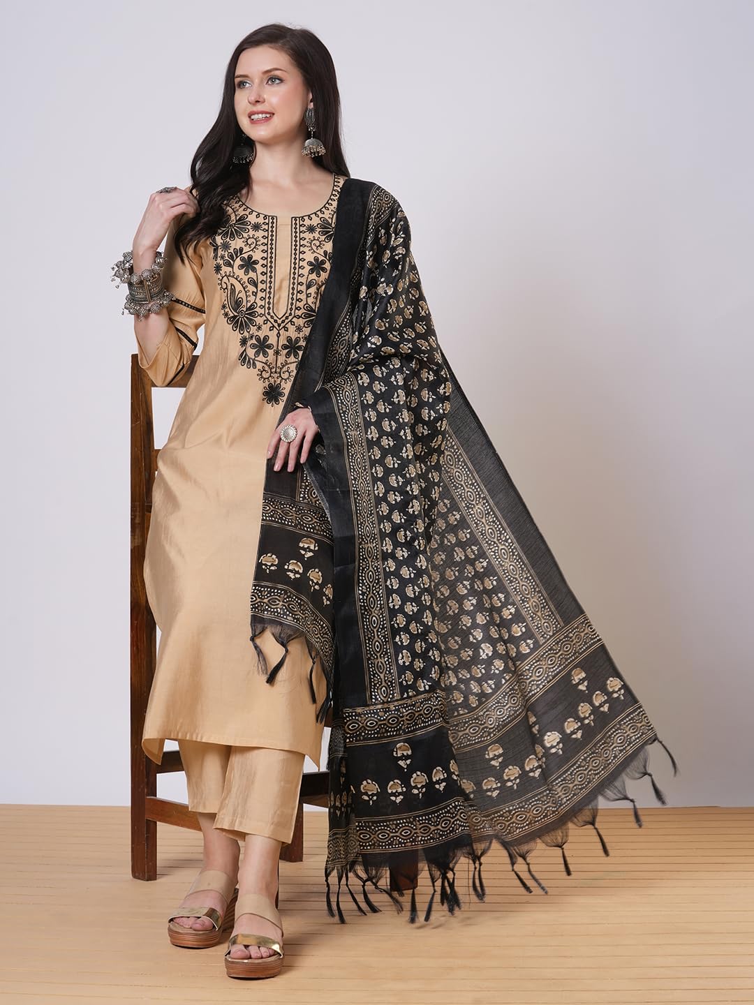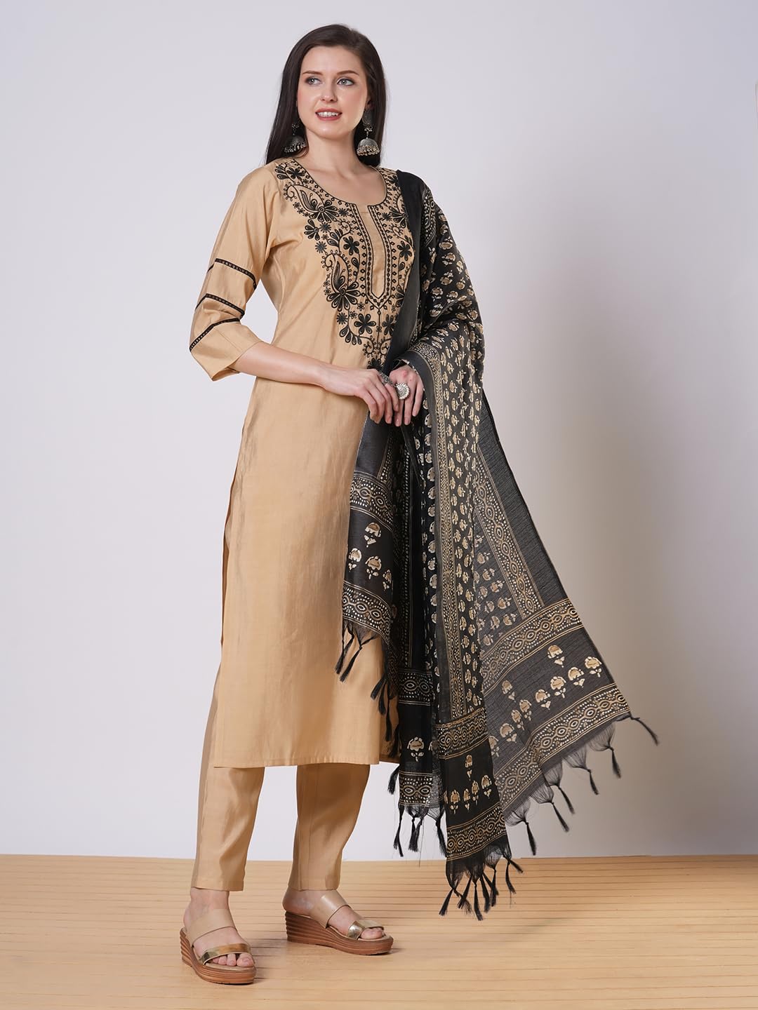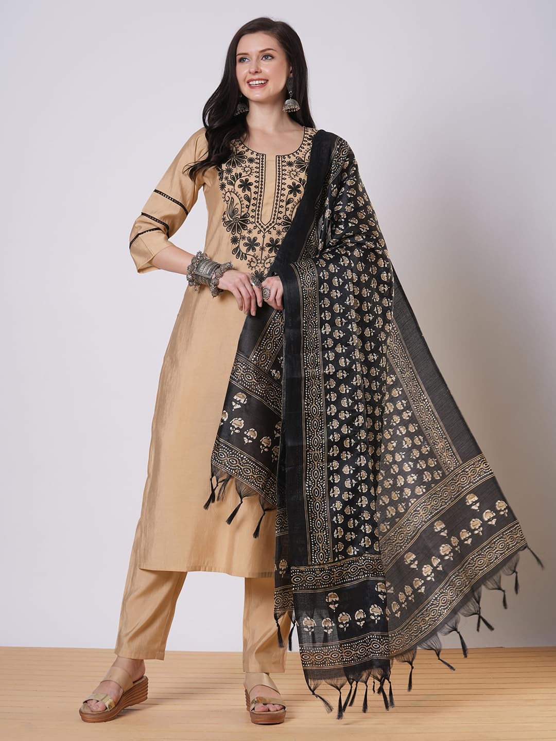 GoSriKi Women’s Rayon Viscose Straight Embroidered Kurta with Pant & Dupatta
