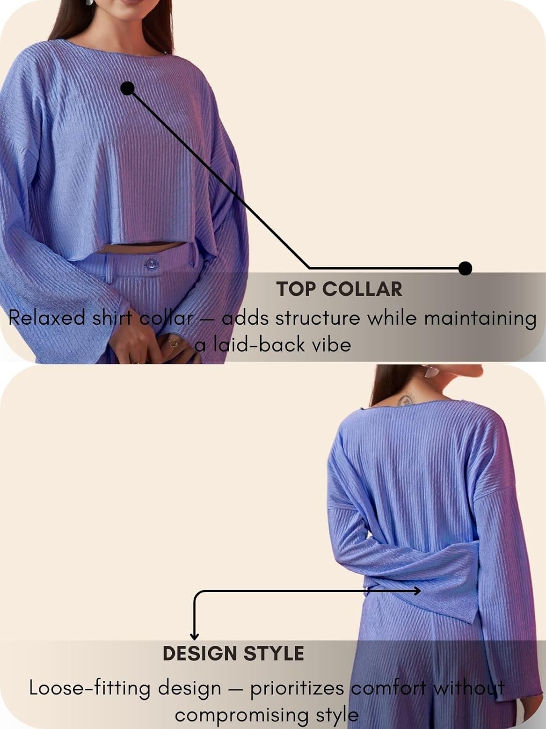 Elevate your everyday with this sleek light blue co-ord set. Designed for versatility, it pairs a long-sleeve top with wide-leg pants—perfect for office hours, travel days, or casual outings. Style it with heels for events or flats for a relaxed, polished vibe.