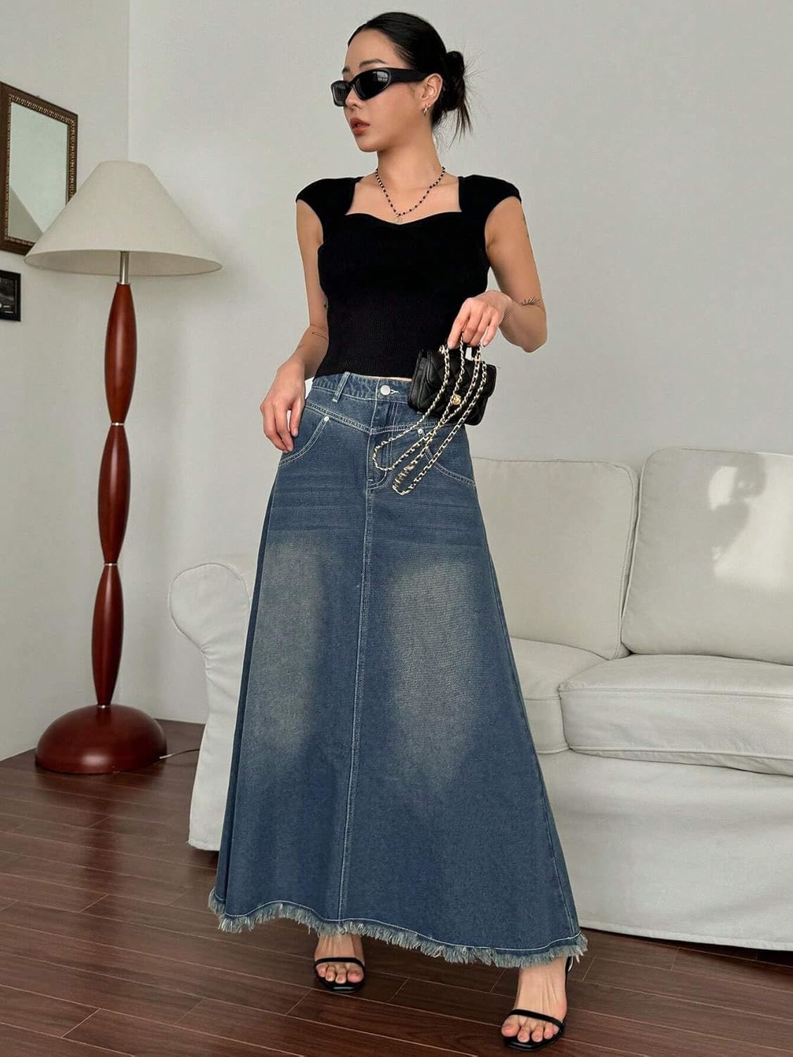 Upgrade your wardrobe with the GRECIILOOKS Women’s High-Waist A-Line Denim Skirt, a timeless and stylish piece designed for modern women who love effortless fashion. Made from high-quality denim, this long maxi skirt provides exceptional comfort and durability, ensuring you look and feel your best all day long.With its flattering high-waist design and relaxed A-line fit, this skirt complements all body types while offering ease of movement. The trendy raw hemline adds a touch of contemporary chic, making it perfect for casual outings, work, or semi-formal occasions.Designed with functionality in mind, the skirt features a classic front button and zipper closure, belt loops, and two practical back pockets for added convenience. Pair it effortlessly with a crop top, blouse, or jacket for versatile styling. Whether you prefer heels, sandals, or sneakers, this long denim skirt will complete your look with elegance and charm.