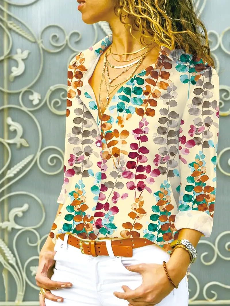 This shirt blends the grace of watercolor leaf motifs with a polished button-down style. A seasonal wardrobe essential for the woman who values effortless fashion with a creative edge.