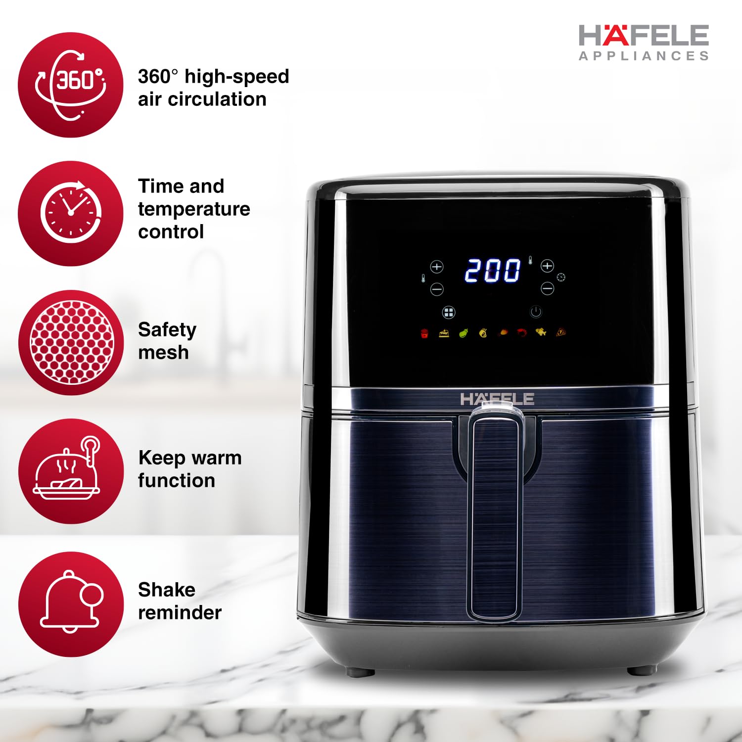GERMAN DESIGN: Combining sleek aesthetics with advanced German technology. The NOIL Lite Air Fryer showcases a sophisticated design with a digital touch panel and an aerodynamically crafted non-stick fry basket for consistent frying.