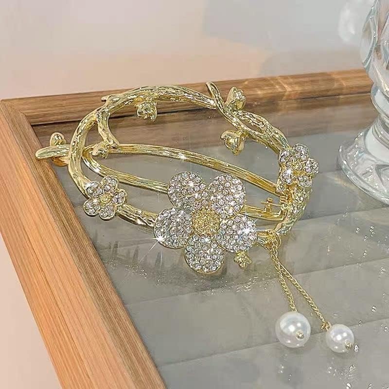 Elevate your hairstyling game with this exquisite pearl flower hair clip from FLAIR FASCINATORS. This 10-centimetre banana clip features a stunning tassel pendant adorned with sparkling rhinestones and zircon details, creating an elegant headdress accessory. Perfect for women and girls alike, this versatile hair clip combines fashion with functionality, suitable for all hair types. The metal construction ensures durability, while the golden finish adds a touch of sophistication to any outfit. Each pack contains one uniquely designed clip that serves as a beautiful hair accessory for both casual and formal occasions. The secure claw design keeps your hair firmly in place while adding a glamorous accent to your overall look. Whether you’re heading to a festival, wedding, or simply want to add a touch of elegance to your everyday style, this hair clip is an ideal choice for creating various hairstyles with ease.