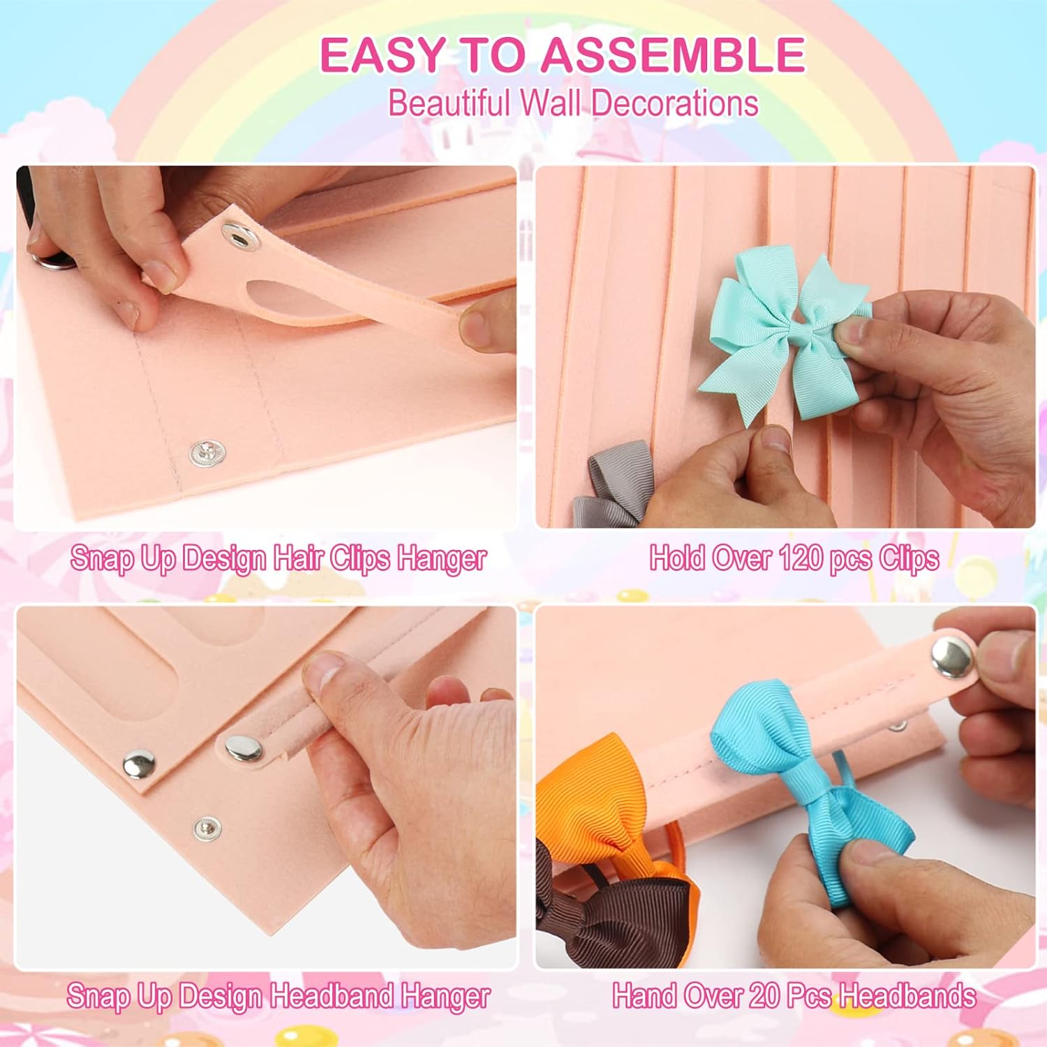 【One Step Assemble, Easy 】The unique and customized construction of hair bows organizer is very easy to assemble. Just one step to complete the installation. Snap each ribbons on each row to hang it on the door, wall, closet with double rope. No small parts might cause any hazels for your baby girls.