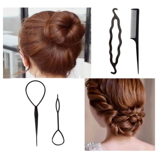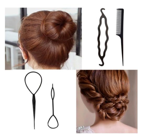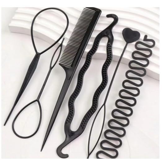 Combs, hair coils, hair pulling pins hair accessories all in one, is the perfect hair styling magic tool Package include: 2*topsy tail kit,2*bun maker,1*french braid tool, 1*hair comb (total 6 pieces)