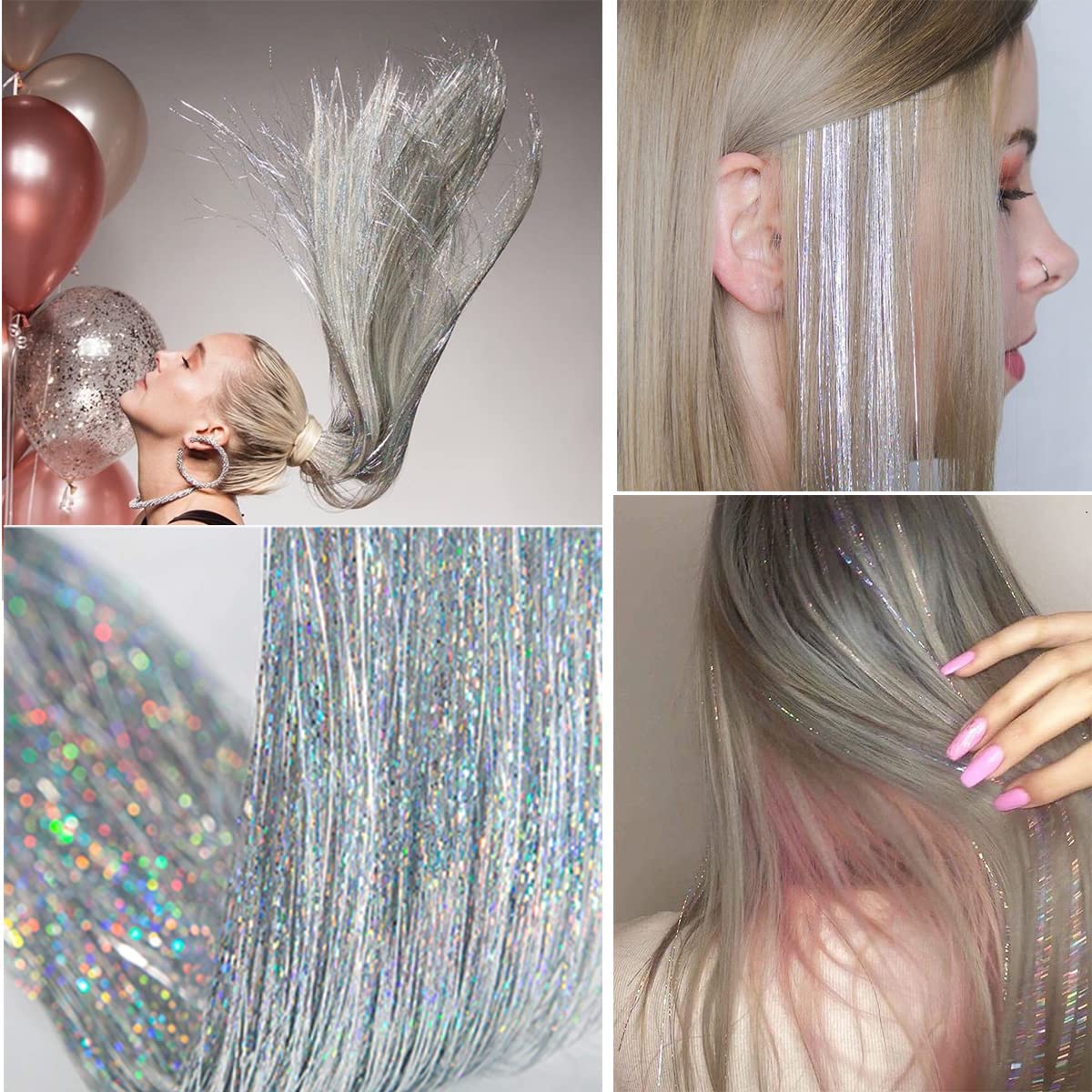 Hair Tinsel Strands Kit Sparkling Silk Fairy Hair Shiny Hair Flairs Extensions Party Highlights Strands Dazzle Glitter Extensions Bling Synthetic Hairpieces Set (Silver)