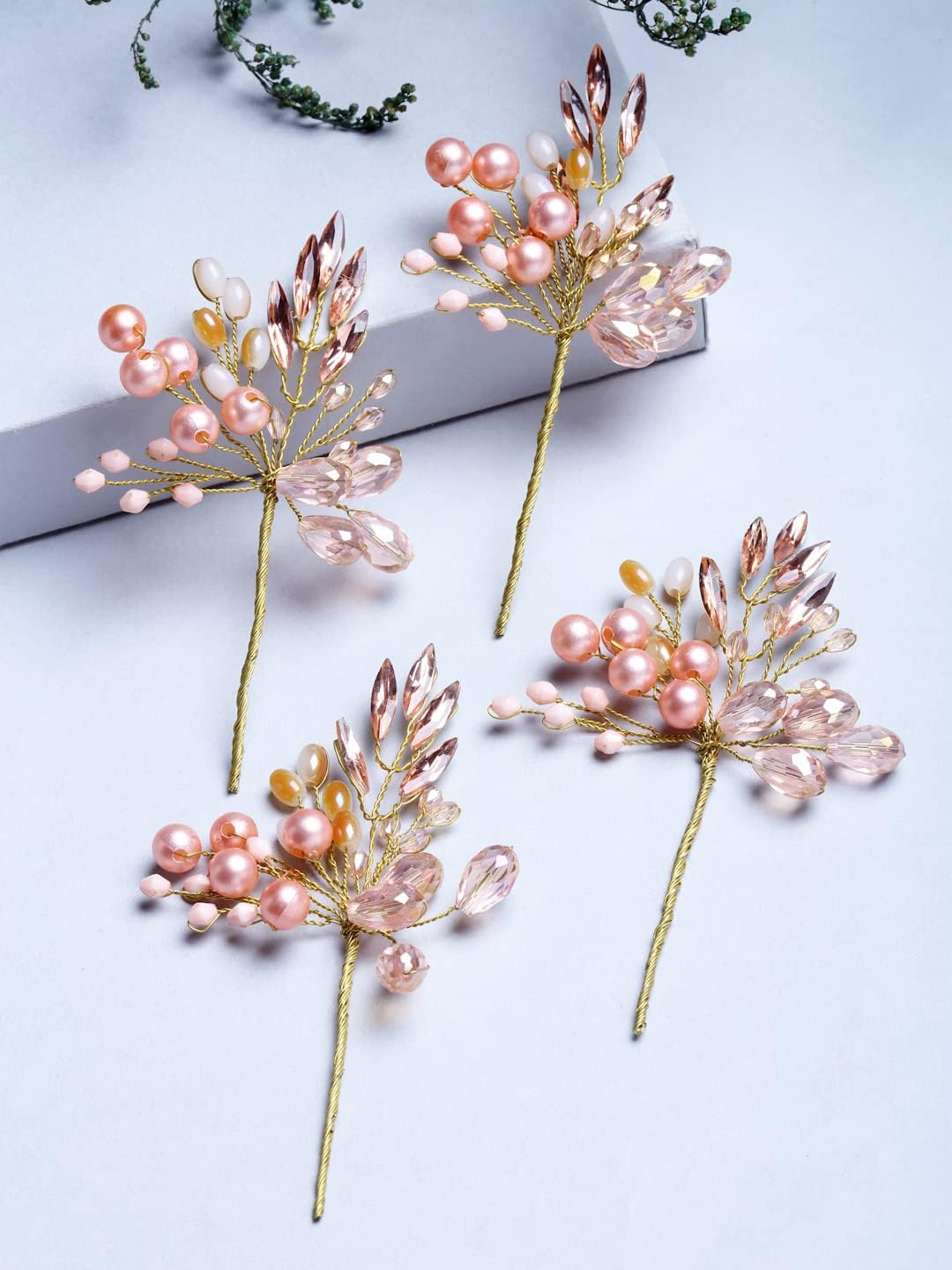ELEGANT DESIGN: Set of 4 handmade hair pins featuring delicate rose gold pearls and sparkling crystal beads arranged in a beautiful floral spray pattern