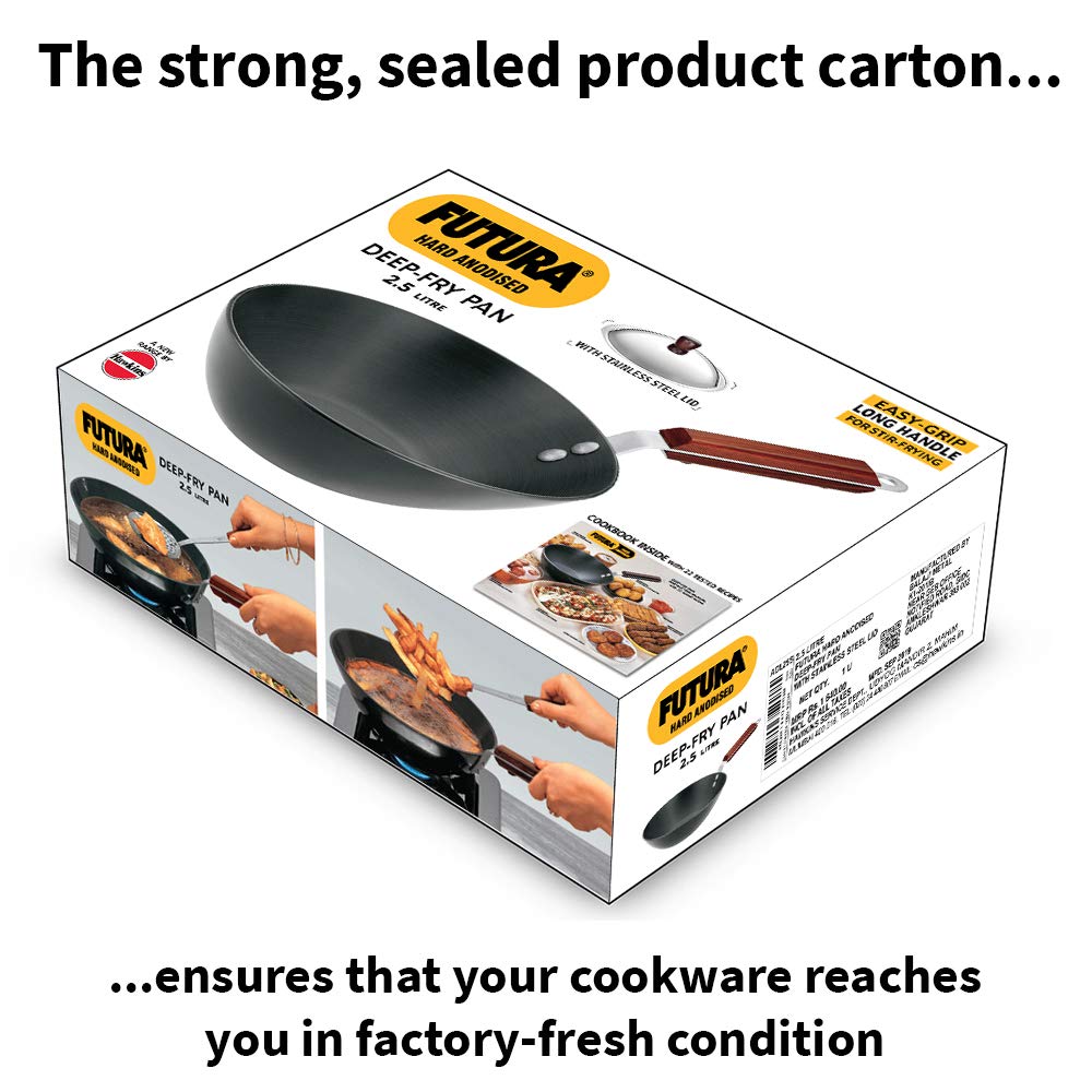 The protective hard anodised surface is 2.4 times stronger than steel. So you may use metal ladles for cooking in the Futura Hard Anodised Deep-Fry pan with complete peace of mind.