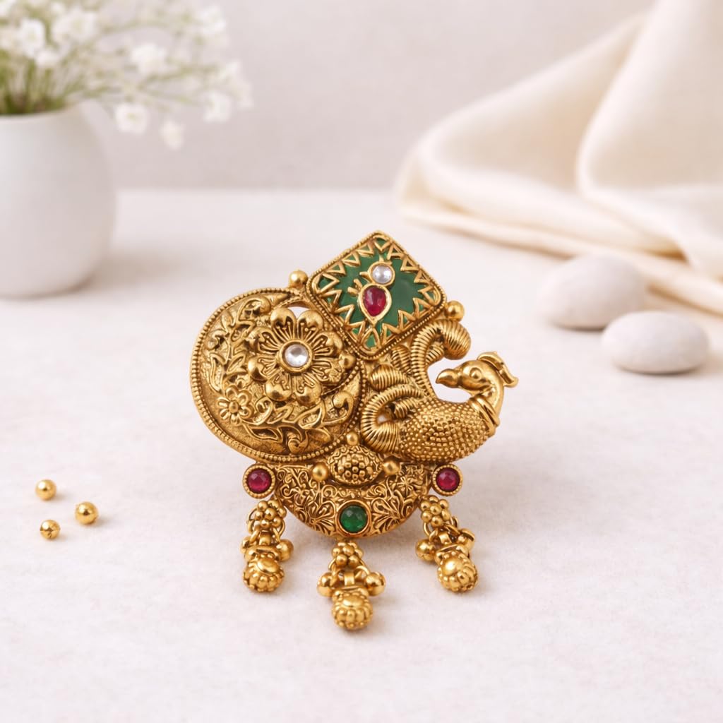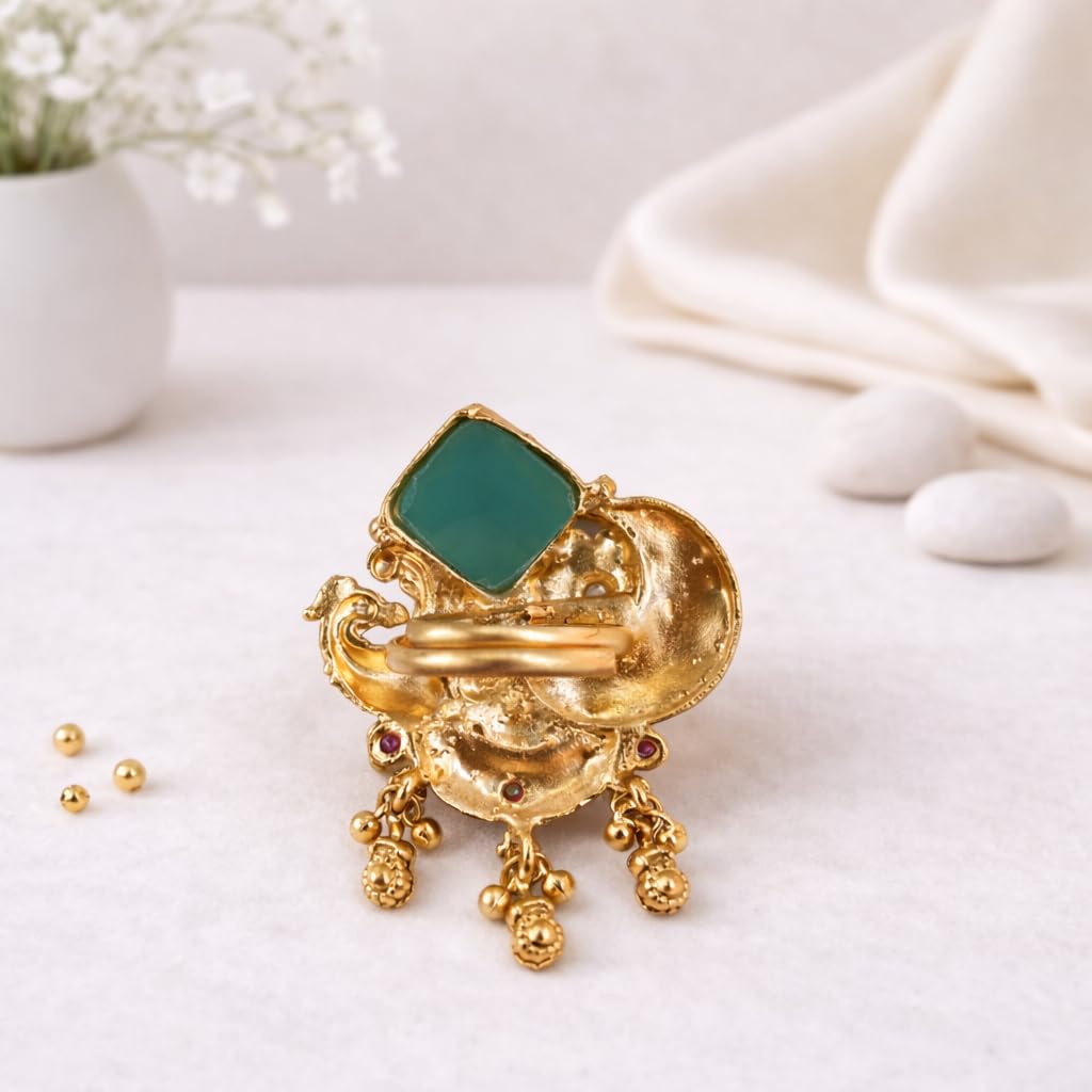 Heritage Style Elephant Motif Gold Plated Adjustable Ring with Latkan Green Stones Kundan Brass Jewellery