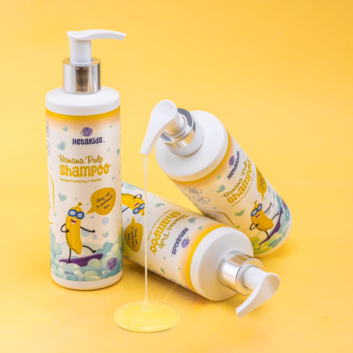 Hetakids Banana Shampoo for Kids (5-12 Years) | Nourishing & Moisturizing | Frizz-Free, Soft & Silky Hair | Strengthens, Reduces Hair Fall & Itchy Scalp | Enriched with Banana Pulp, Biotin, Vitamin C & Glycerin | Paraben & Sulfate-Free | 250ml (Pack of 2)