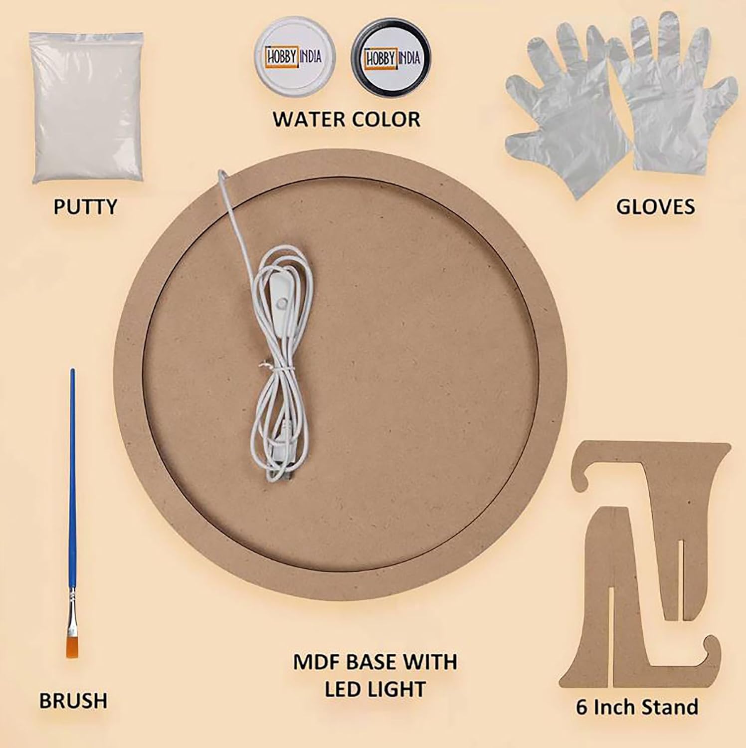 ✅ Kit Contains – MDF Base With LED Light, MDF Easel Stand, Black & White Color,1 Paint Brush,(100 gram) Putty Powder,2 Hand Gloves