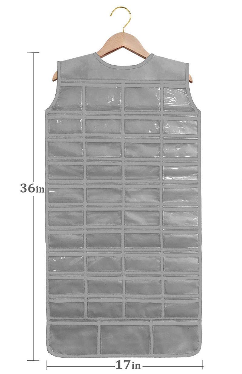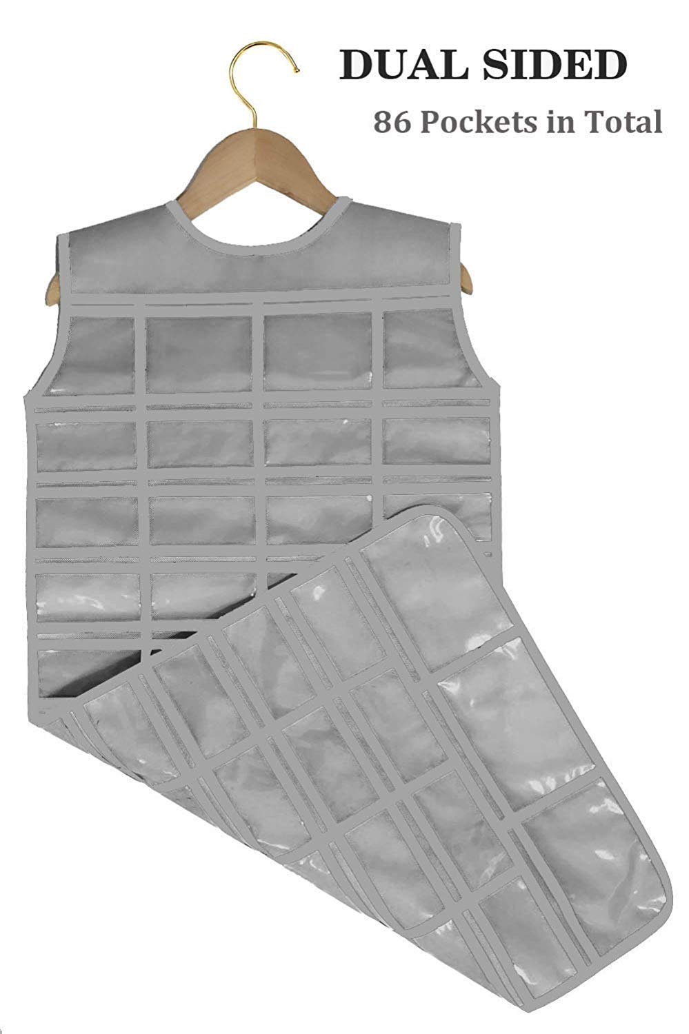 【MULTI PURPOSE】Jewelry organizer size Approximately: 35″H x 17.5″W, a must-have piece that can hang on closet pole, door, or wall.Each sides has 43 see-through pockets.Ideal for storing kinds of jewelry items such as necklaces, bracelets, rings, earrings and etc. No need to put everything altogether and then scatter them throughout the room in the quest to find the little rings or earrings. You can put them in separate transparent pockets and select the one as they are visible.