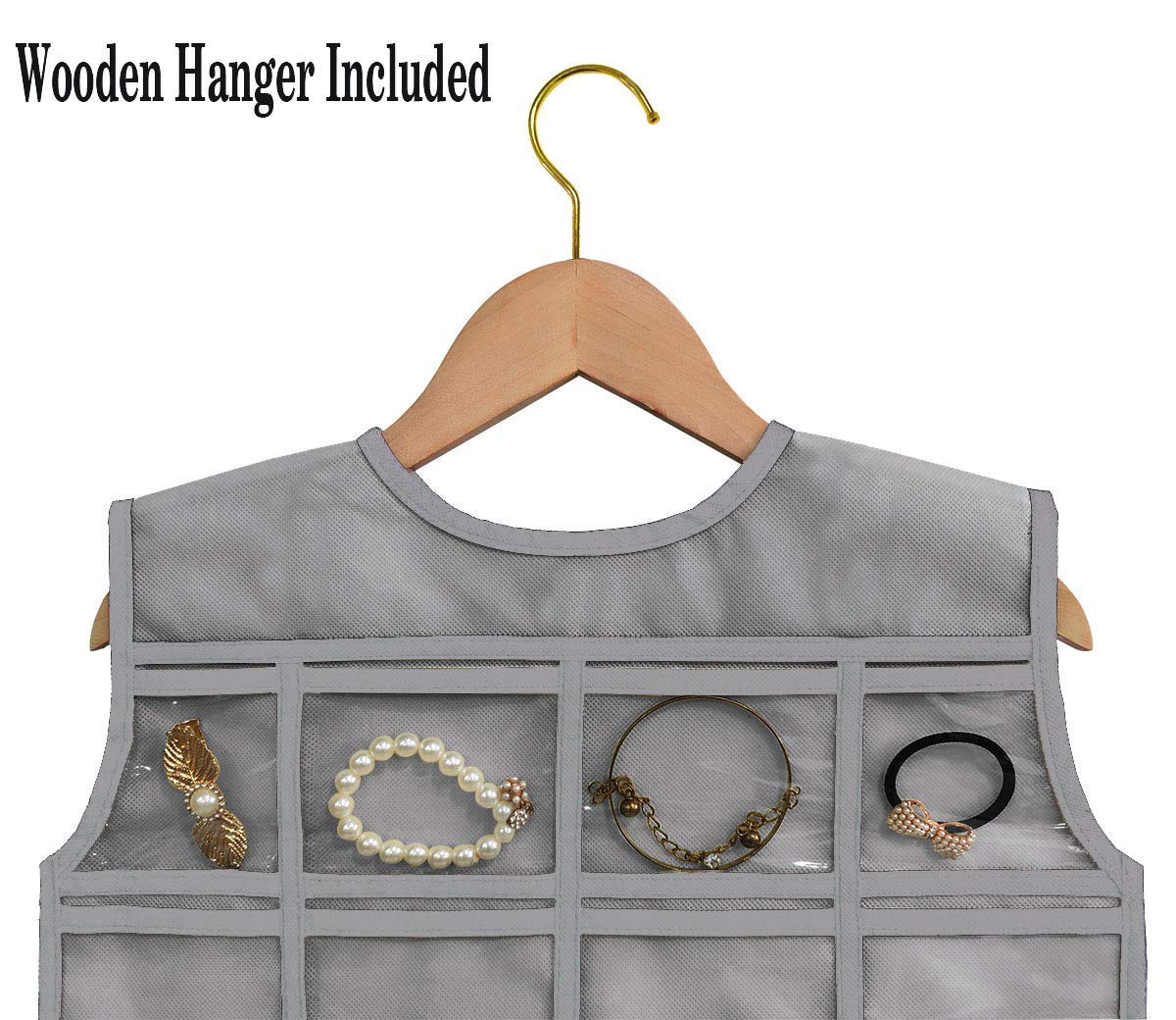 Color:White Specifications ✅Design:Double-sided ✔Material: Non-woven Fabric+ PVC ✅Size (approx.): 35 H× 17.5 W inch Product Features ✔The jewelry organizer has an eye-catching dress-like design. ✅No matter hanging in closet or wardrobe,will be a beautiful scenery. ✔Double-sided design,each sides has 43 clear-vinyl pockets. ✅Made of soft Non-woven polyester fabrics and transparent PVC window. ✔Transparent PVC window, easily view and pick out the jewelry . ✅Come with removable heavy duty wooden hanger,will integrate well in closet. ✔Hanger hook can be rotated to adjust the direction of the jewelry organizer. ✅Perfect for pendants,chains,necklaces, bracelets, rings, earrings and etc. ✔It can be folded,also works great as a portable jewelry travel organizer. Package Included ✔1X Jewelry organizer ✅1X Wooden Hanger