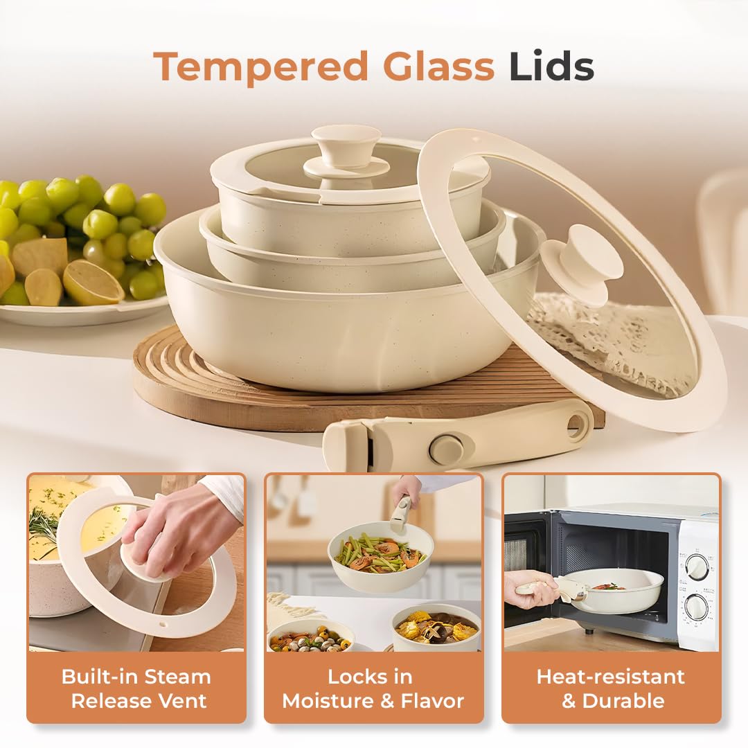 Complete Kitchen Solution – Includes 10”/8” fry pans, 3qt/2qt saucepans, 4qt sauté pan, 2 handles, 2 silicone lids, and 2 storage lids – everything for daily meals.
