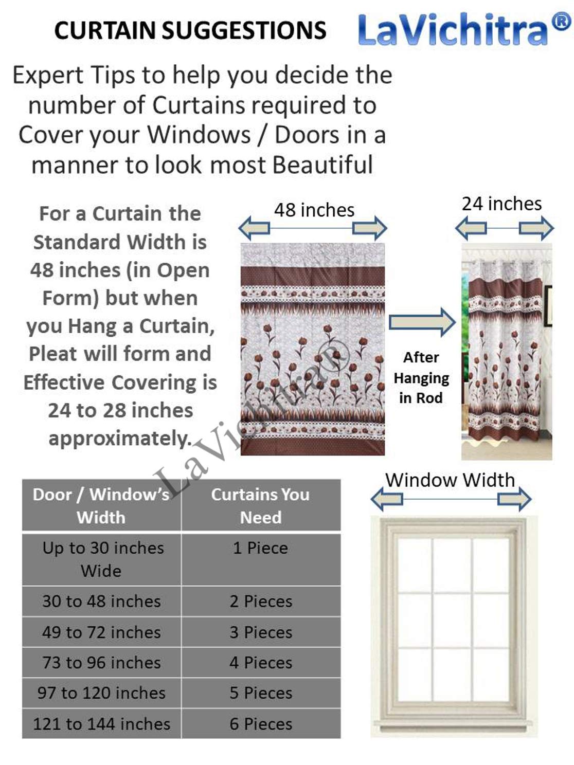 Package contains: 2 Piece Curtain. Each Curtain/Panel Mesures:(HeightXWidth): (84 inch x 48 inch) or (213 cm x 120 cm) or (7 Feet x 4 Feet)