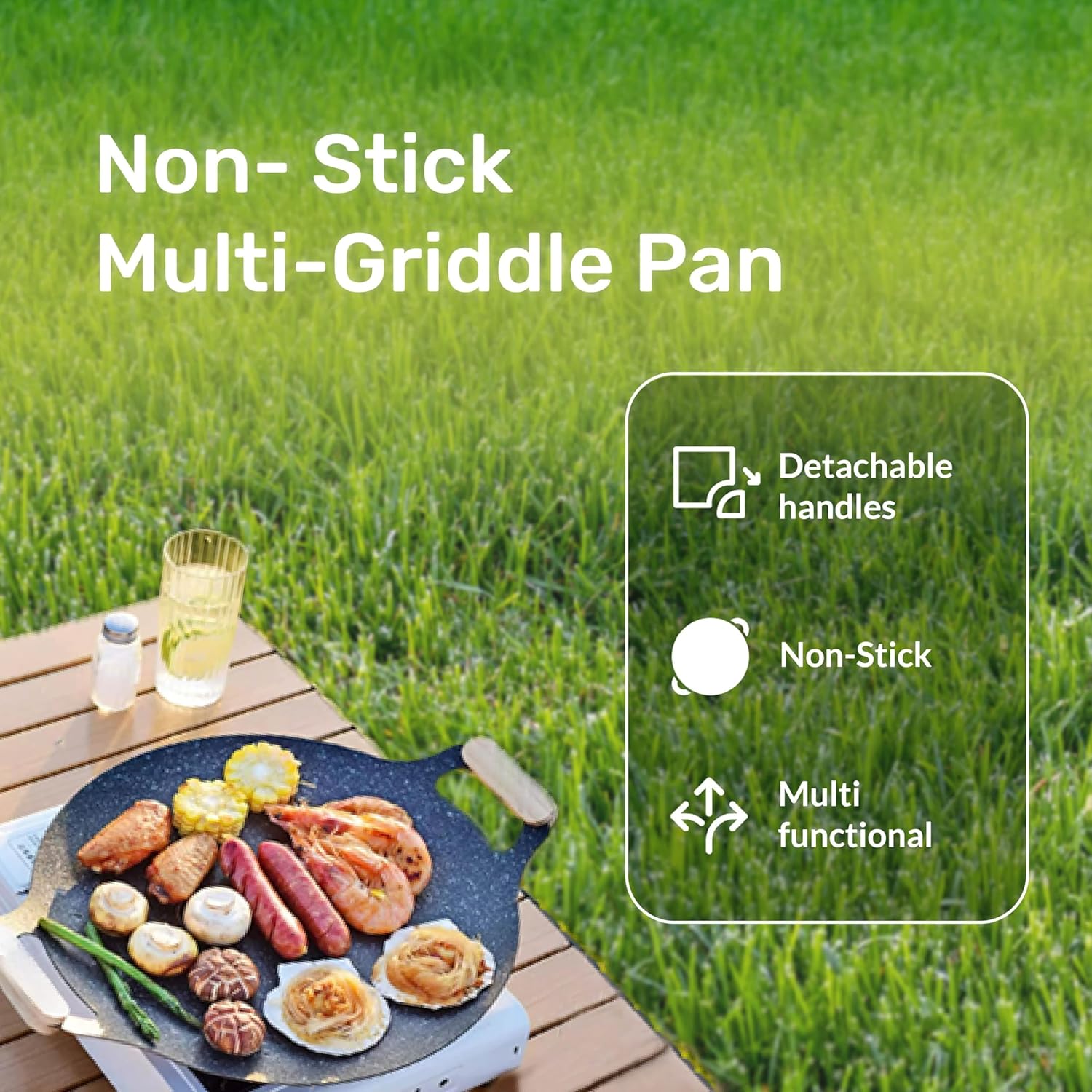 The Homero lightweight and durable multi-griddle pan is designed for versatile cooking, from roasting and frying to stewing. Made with an aluminum alloy base and a water-based non-stick coating, it ensures effortless food release and easy cleaning. The removable wooden handles provide a secure grip, while the built-in oil rack offers convenience for frying. Compatible with induction, gas, and open flames, this griddle is perfect for home kitchens, outdoor BBQs, and camping adventures.