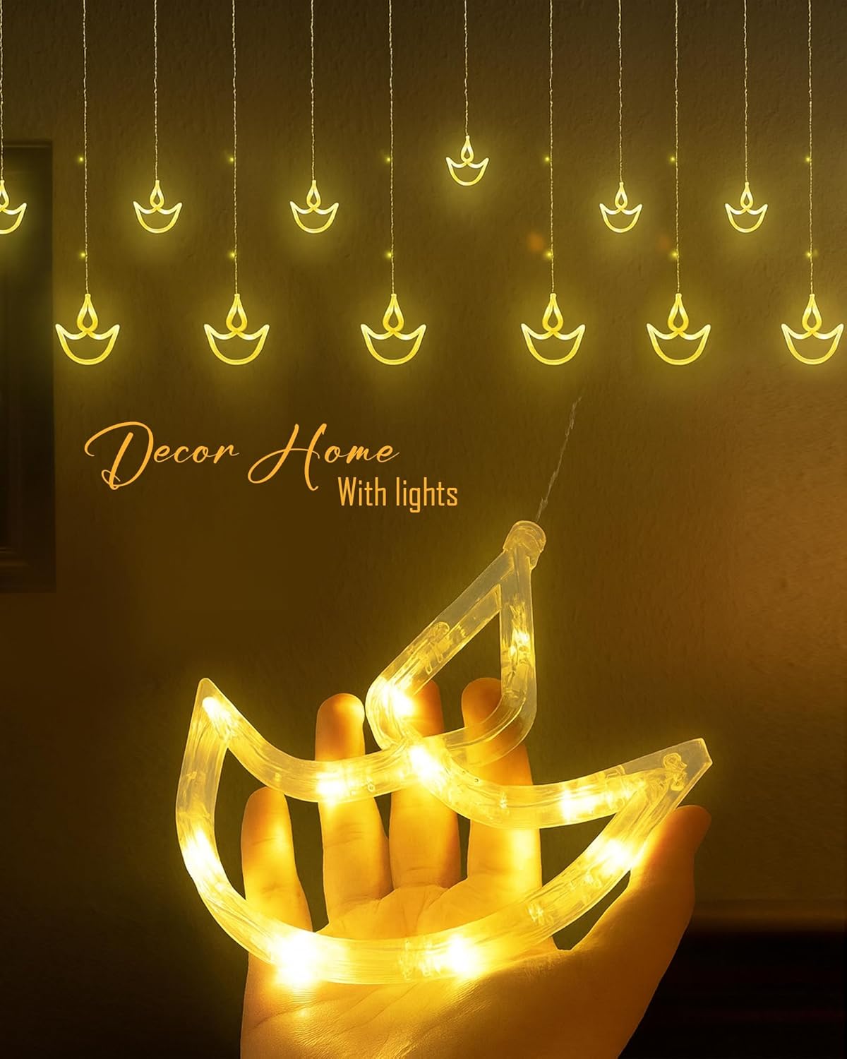 Diwali Lights with Diya Design- Celebrate the Festival of Lights with our traditional Diya Curtain Lights, featuring 12 diya-shaped LED ornaments. These classic Diwali lights create a warm, spiritual glow ideal for Happy Diwali decorations across your home.