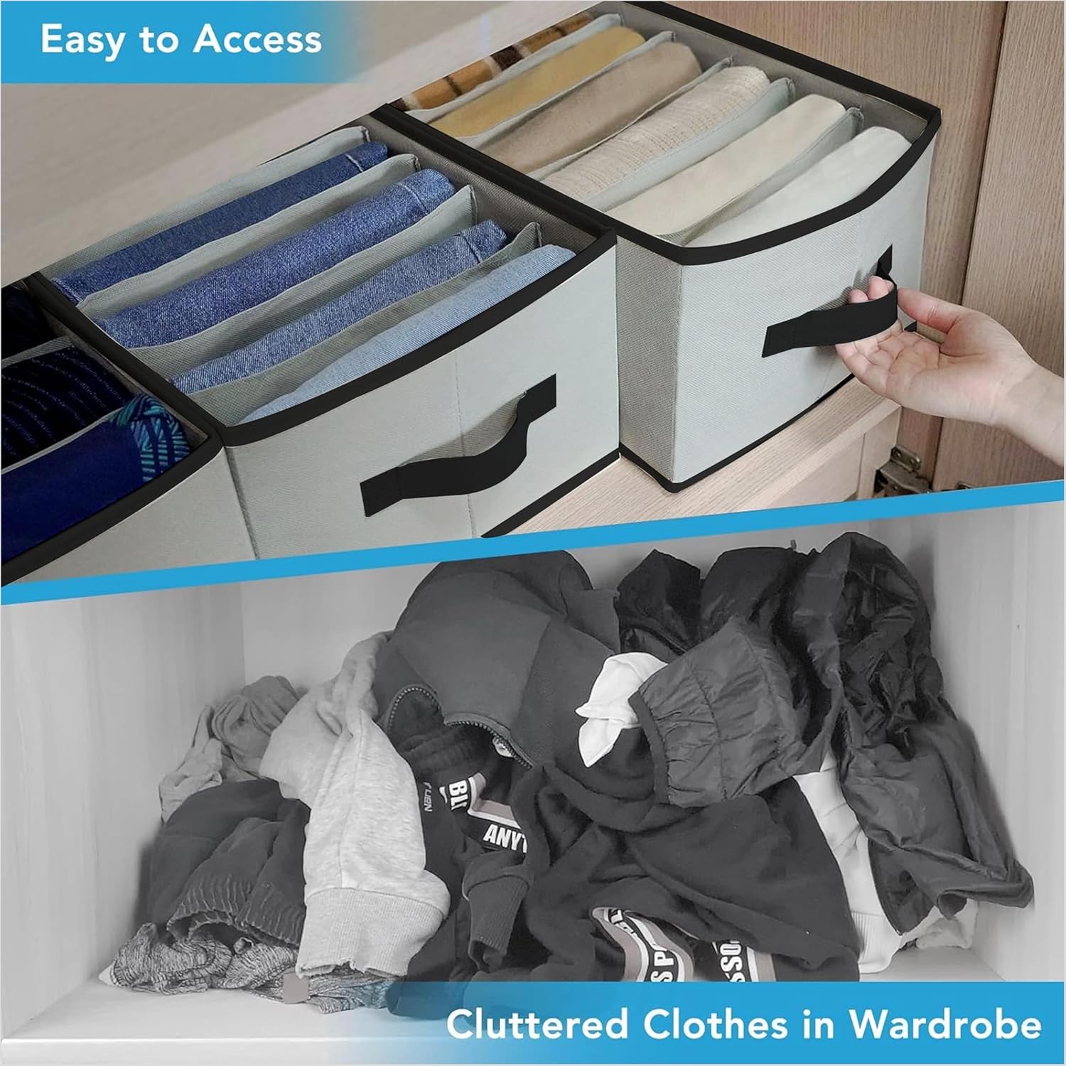 Wardrobe clothes organizer for jeans are 40x27x20cm. The 5-7 partitions are larger than other clothes organizer, perfect for pants of different thickness. With the dividers, the storage box can keep items tidy and neat, easy for finding needed things.