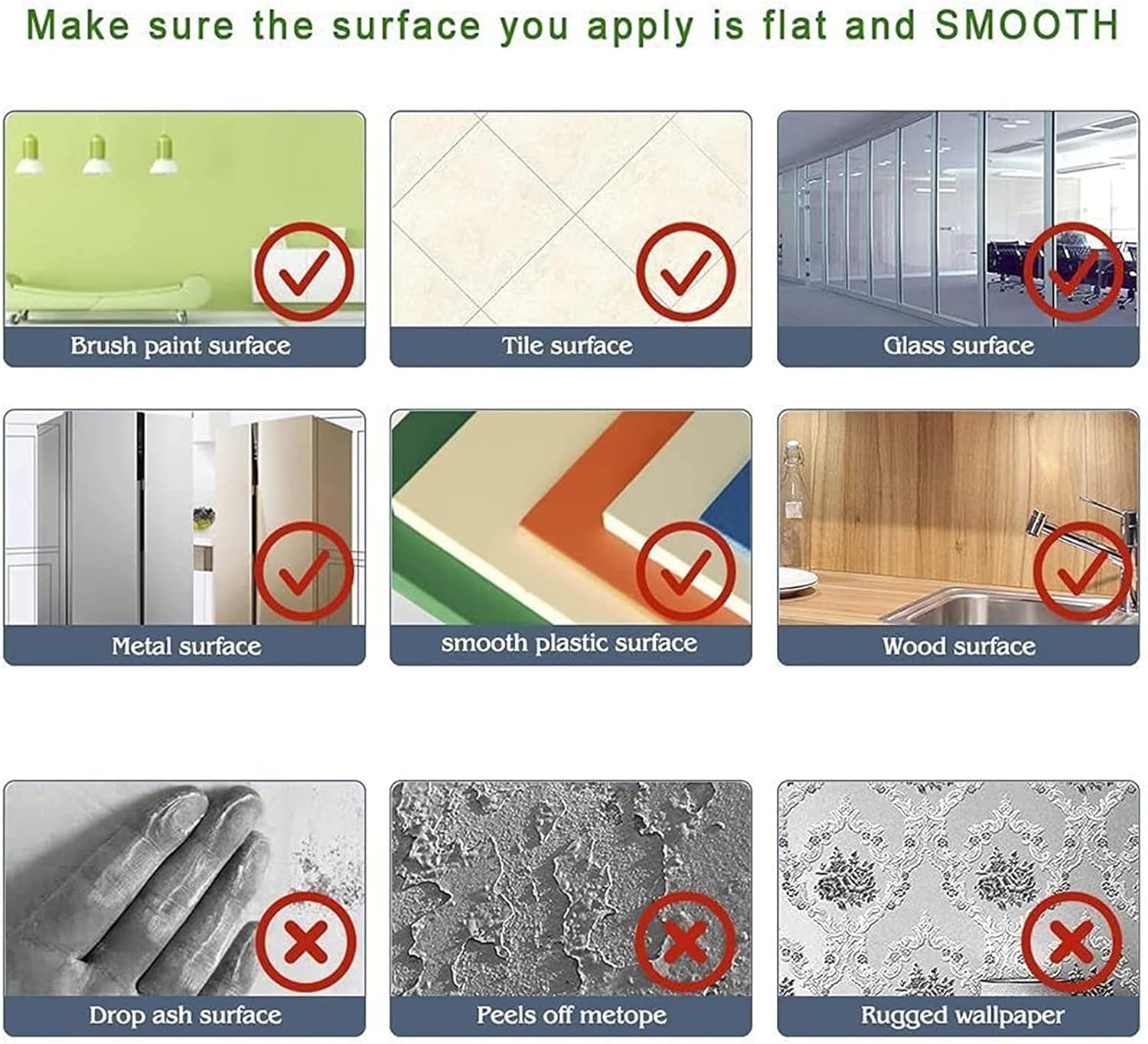 DON’T apply to Textured, Rough and Uneven Wall Surface, which will weaken the adhesive strength