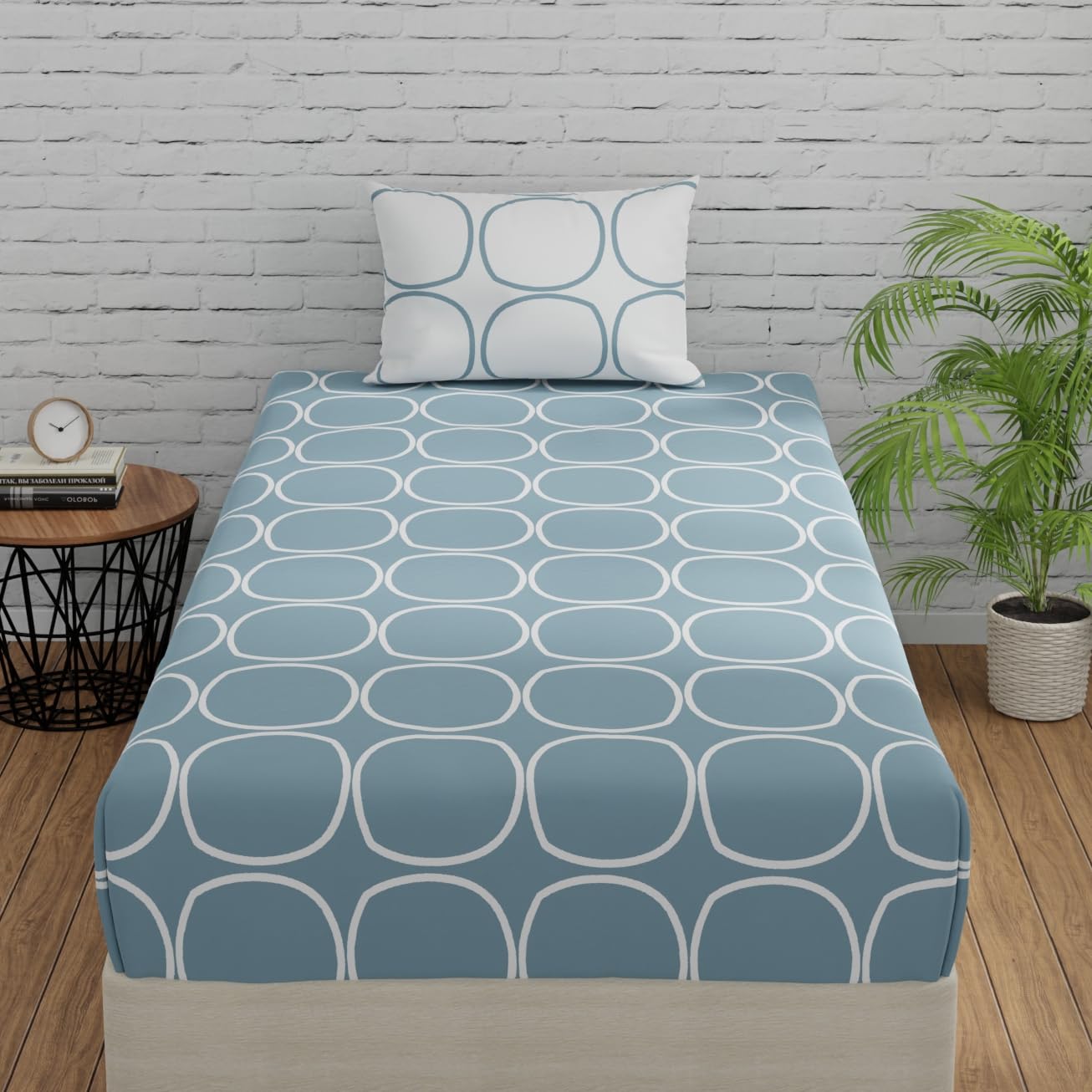 Single Size Fitted Bedsheet: 36 inches (width) x 78 inches (length) + 8 inch drop or 91 x 198 cm + 20 cm drop made for mattresses measuring 36 x 78 inches or 3 x 6.5ft upto 8 inches deep. Pillow Cover – 17 x 27 inches or 43 x 68 cm. Elastic all around for a snug fit on the mattress.