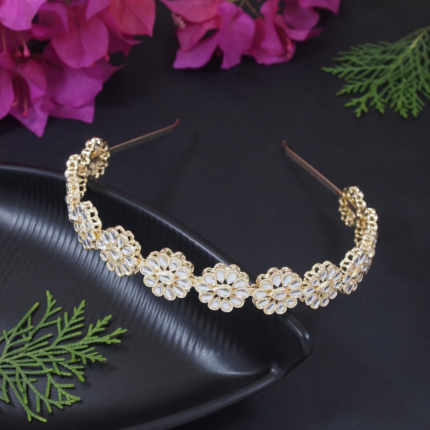 I Jewels Traditional Rajasthani Gold Plated Floral Design Kundan & Pearl Sheeshphool/Mathapatti/Hairband For Women