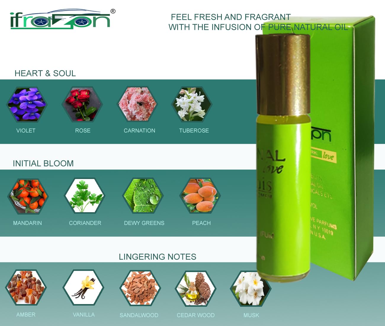 ifrazon Eternallove Eau de parfum Love ( floral-musky ) , 8ml A classic, feminine delight. Luscious peach and sparkling mandarin notes surround a rose garland accented with wild carnation and airy violet. Exotic amber laced with lush woody nuances linger like a romanced daydream.