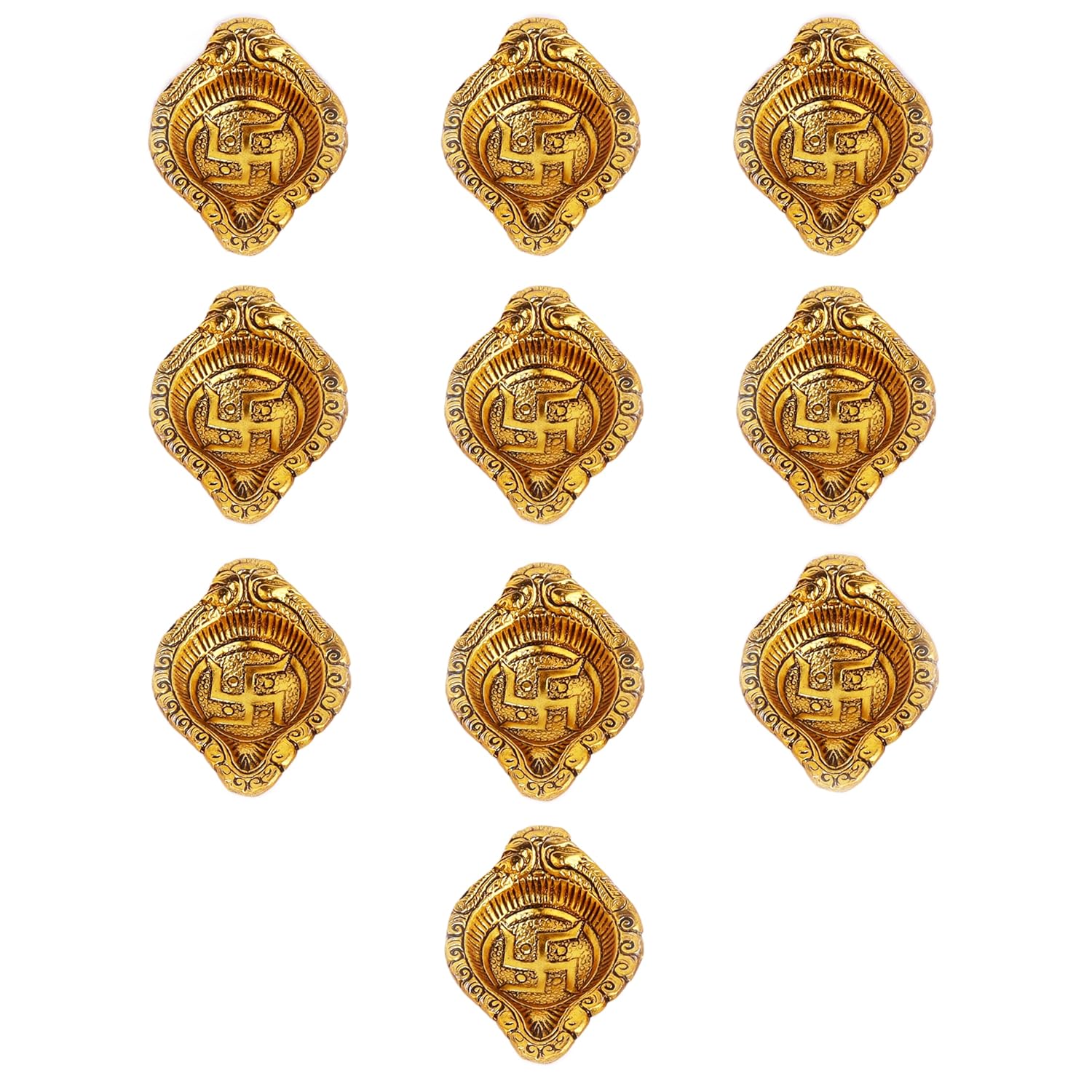 Material: Aluminium | Color: Gold | Package Contains: 10 Pcs Swastik Puja Diyas, securely packed in IndianShelf box. Perfect for pooja, mandir décor, Diwali lighting, festivals & gifting.