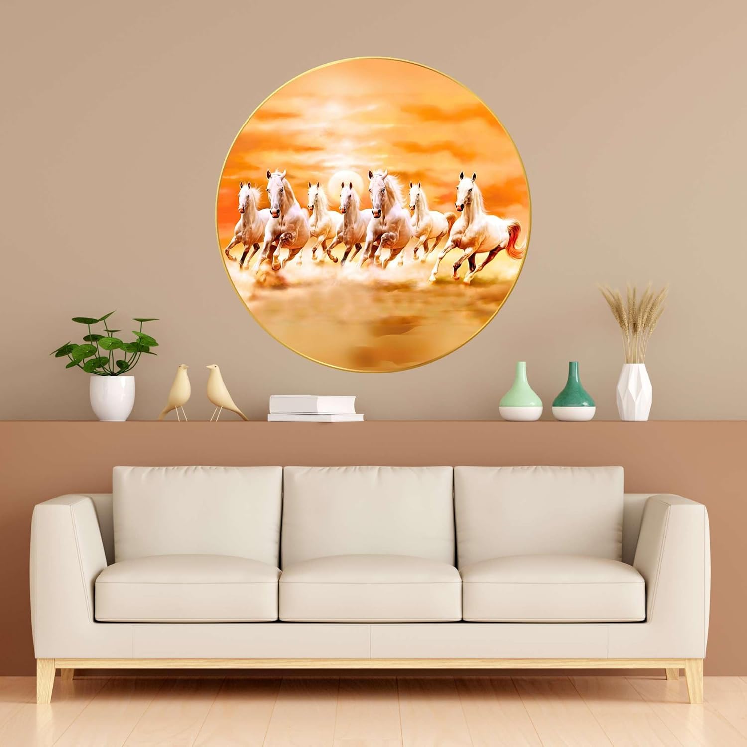 Seven Horses Vastu Painting with Round Golden Frame: Enhance your decor with this exquisite seven horses vastu painting, featuring a luxurious round golden frame and crafted with Vastu principles for positive energy.