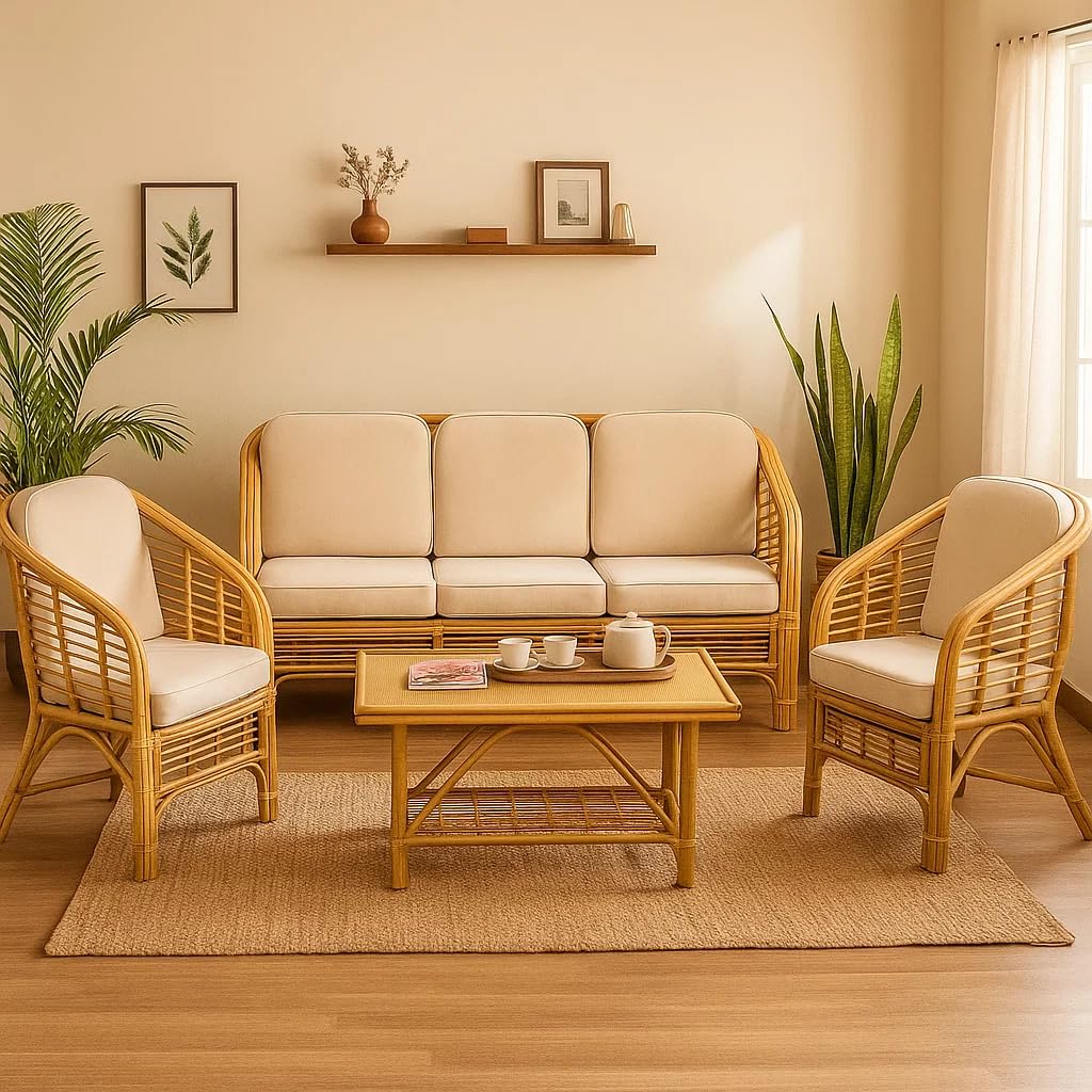 Handcrafted 6-piece furniture set includes 2 single chairs, 1 three-seater sofa, and a center table made with durable cane and wood.