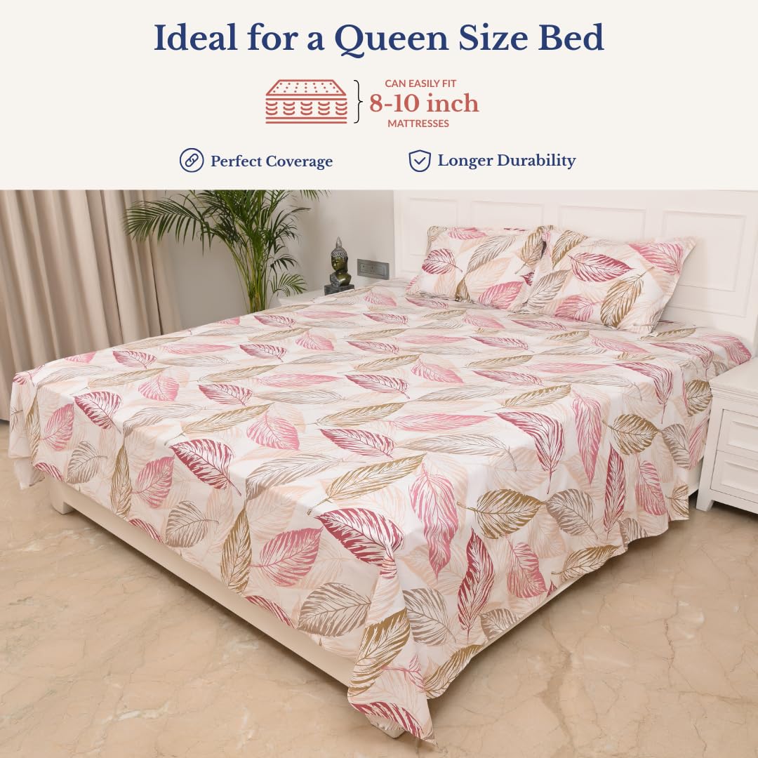 Size That Fits: Bid farewell to ill-fitting bedsheets. Our perfect-sized option covers your queen size double bed without leaving you struggling for coverage, offering the comfort you need. Our 3 piece set includes 1queen size flat sheet (90 x 100 Inches / 7.5ft x 8.5ft / 228cm x 254cm) and 2 pillow covers (18 x 28 Inches / 1.5ft x 2.33 ft / 46cm x 71cm)
