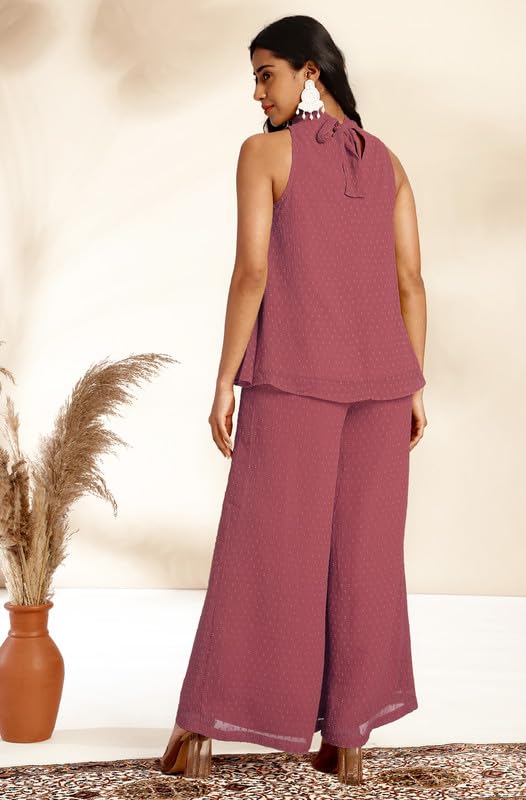 Indulge in the carefree charm of the Yellow Dobby Chiffon Co-ord Set, a perfect blend of comfort and style. The A-Line sleeveless top, crafted from solid dobby chiffon, elevates a casual yet chic vibe. The halter neckline with gathers adds a touch of sophistication, while the back tie-up detail adds a playful twist to the ensemble. Paired with flared palazzo pants, this co-ord set is a celebration of easy elegance. Whether it’s a casual day out or a laid-back gathering, this is your go-to choice for a fashionable and relaxed look.