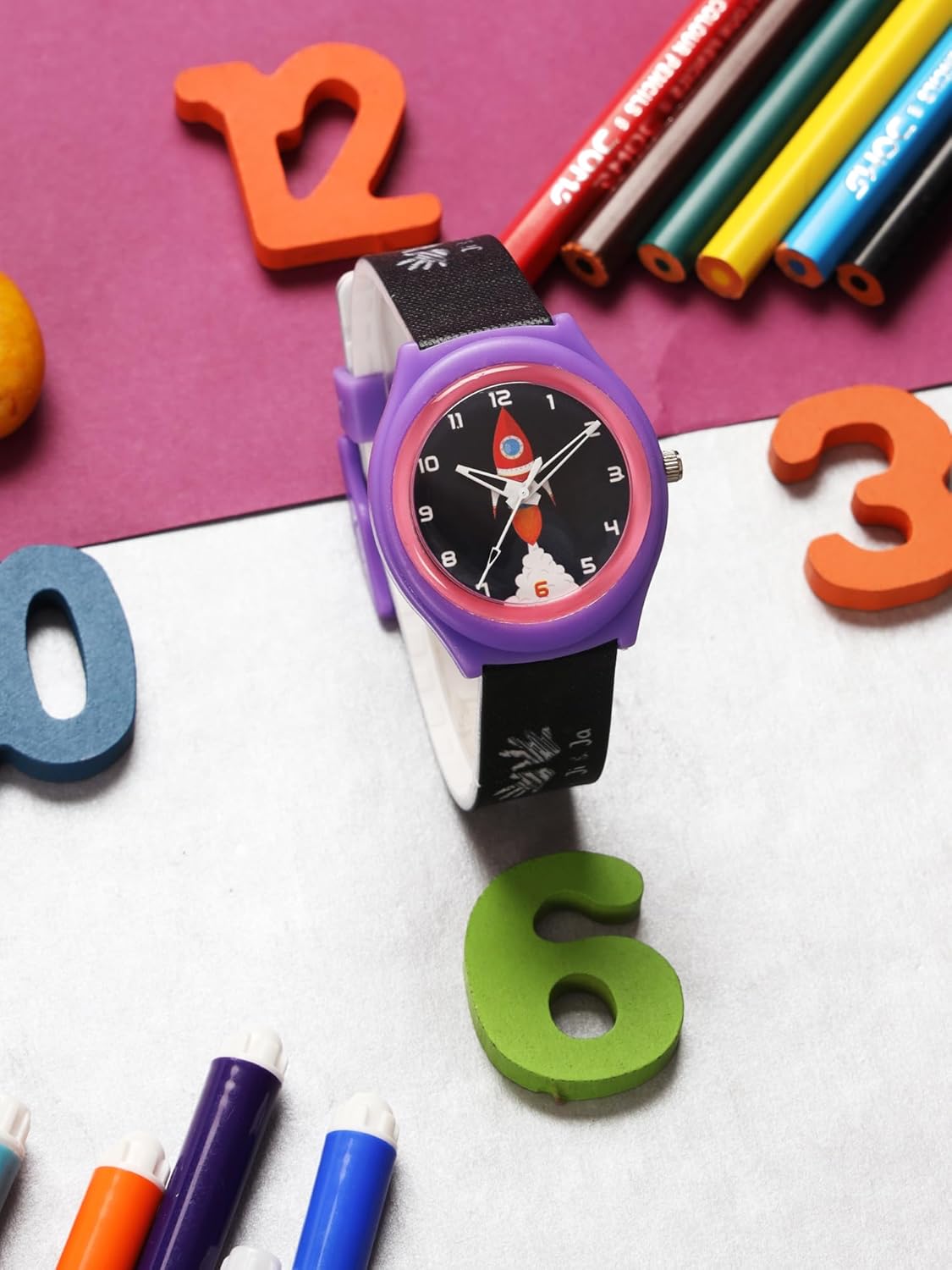 Ji and Ja Kids Watch – Purple Case with Rocket Design Dial & Black Strap | Space Theme Analog Watch for Boys & Girls – JJ232