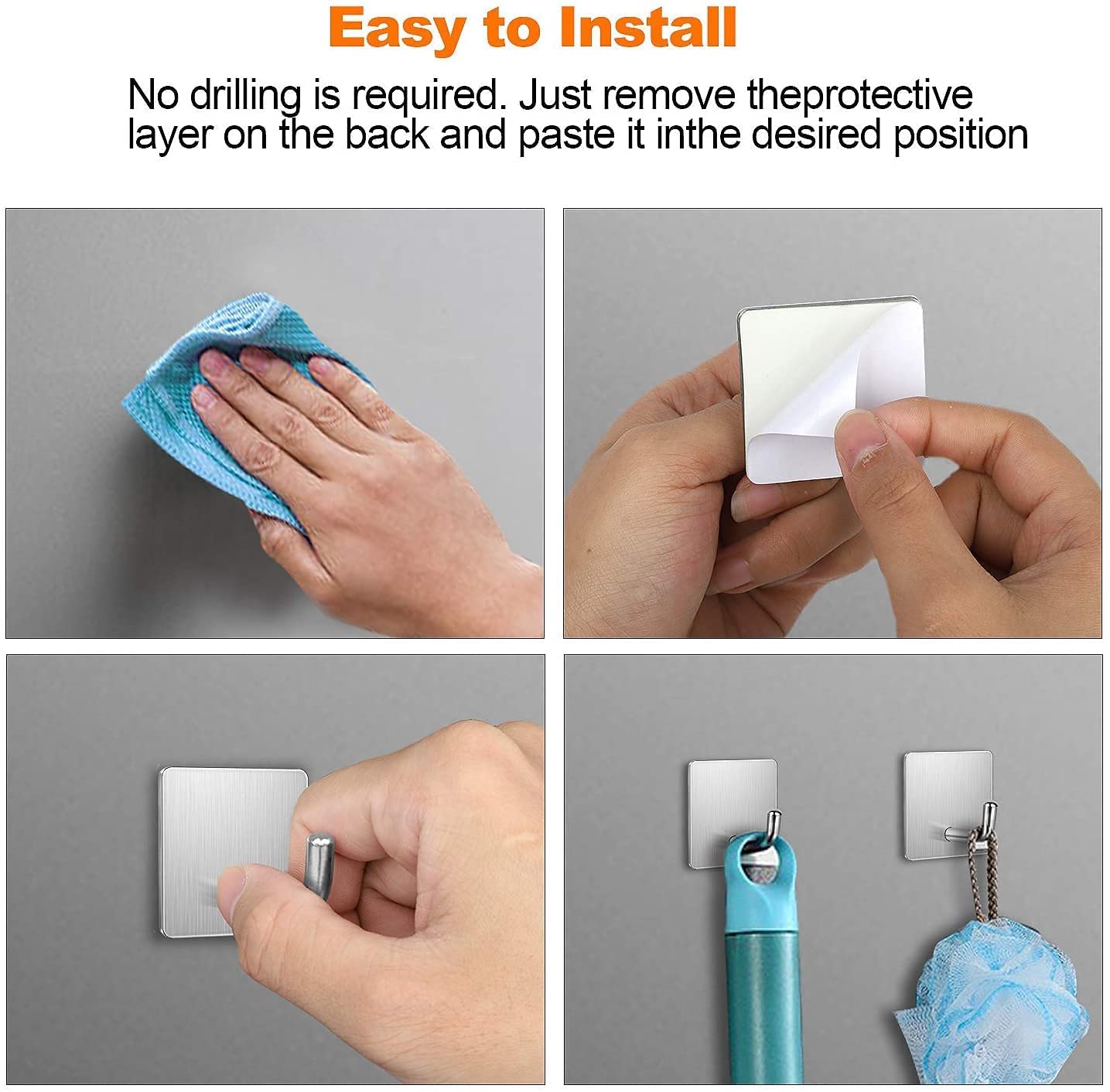 Easy Installation – No Drilling Needed – Simply peel and stick! These self-adhesive wall hooks require no screws or tools, protecting your walls from damage.