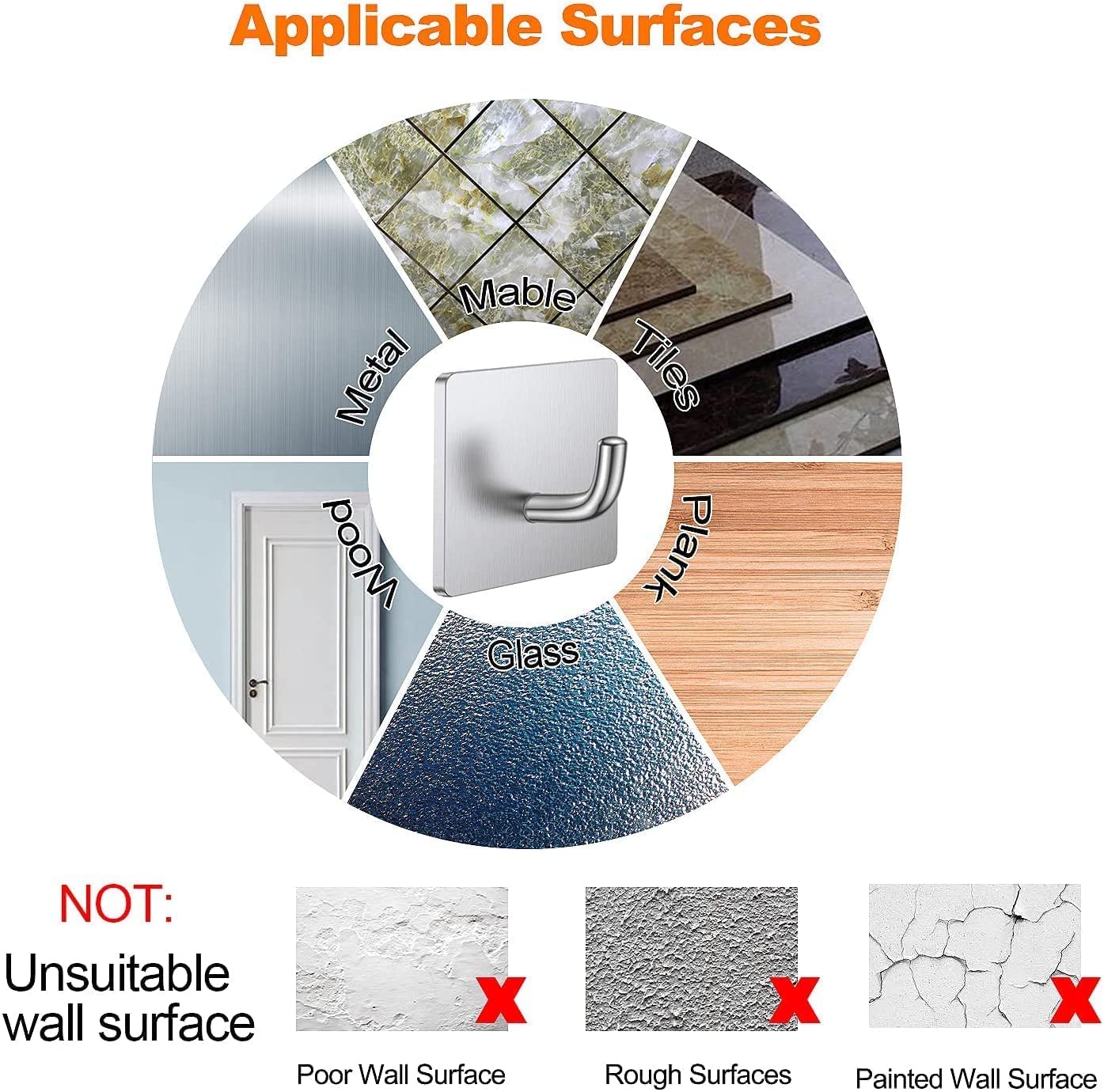 Please make sure the surface is clean and dry, free from dust, water and oil. Please confirm whether the adhesive hooks sticks firmly before hanging heavier objects or valuable items. The sticky hooks is not recommended for wallpaper wall, painted wall and drywall to avoid damaging as its strong adhesion, please make sure the position before use if you need.