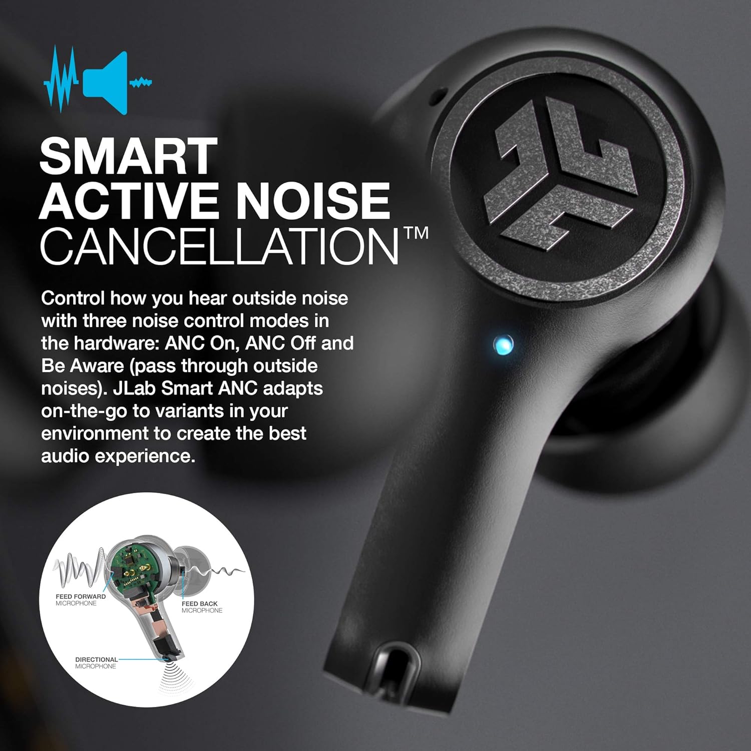 Control how you hear outside noise with three noise control modes in the hardware: ANC On, ANC Off and Be Aware (pass through outside noises). JLab Smart ANC adapts on-the-go to variants in your environment to create the best audio experience. Further customize the noise around you with the JLab Air ANC app.
