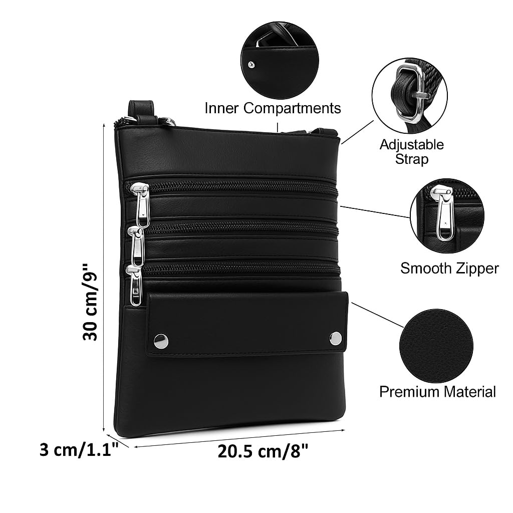 K london everyday style with this sophisticated leather sling bag designed for both men and women. This versatile accessory features a thoughtfully organized design with multiple compartments – one main zipper compartment, three front zipper sections for additional storage, and a secure back zipper pocket for valuables. The front flap with two stud buttons adds both style and utility. Crafted from premium leather with a luxurious gloss finish, this bag measures 20.5 cm in length, 23 cm in height, and 3 cm in width, making it perfect for carrying essentials while maintaining a sleek profile. Weighing approximately 200 grams, it’s lightweight yet durable for daily use. The adjustable shoulder strap ensures comfortable wear whether you’re heading to work, travelling, or attending social gatherings. Its unisex design and practical size make it ideal for carrying passports, phones, wallets, and other daily necessities while maintaining a polished appearance.
