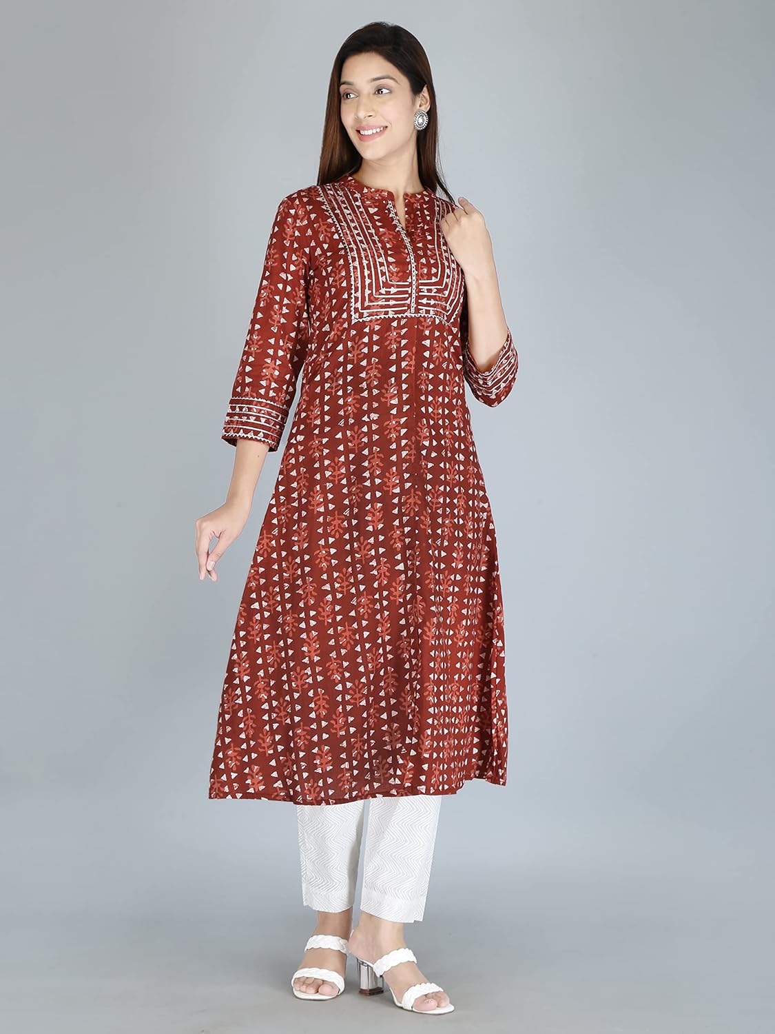 KANNAHI Women’s Pure Cotton Ethnic Motif Print A-line Straight Kurta Jaipuri Sanganeri Printed 3/4 Sleeve Kurti for Casual Party & Festival Wear