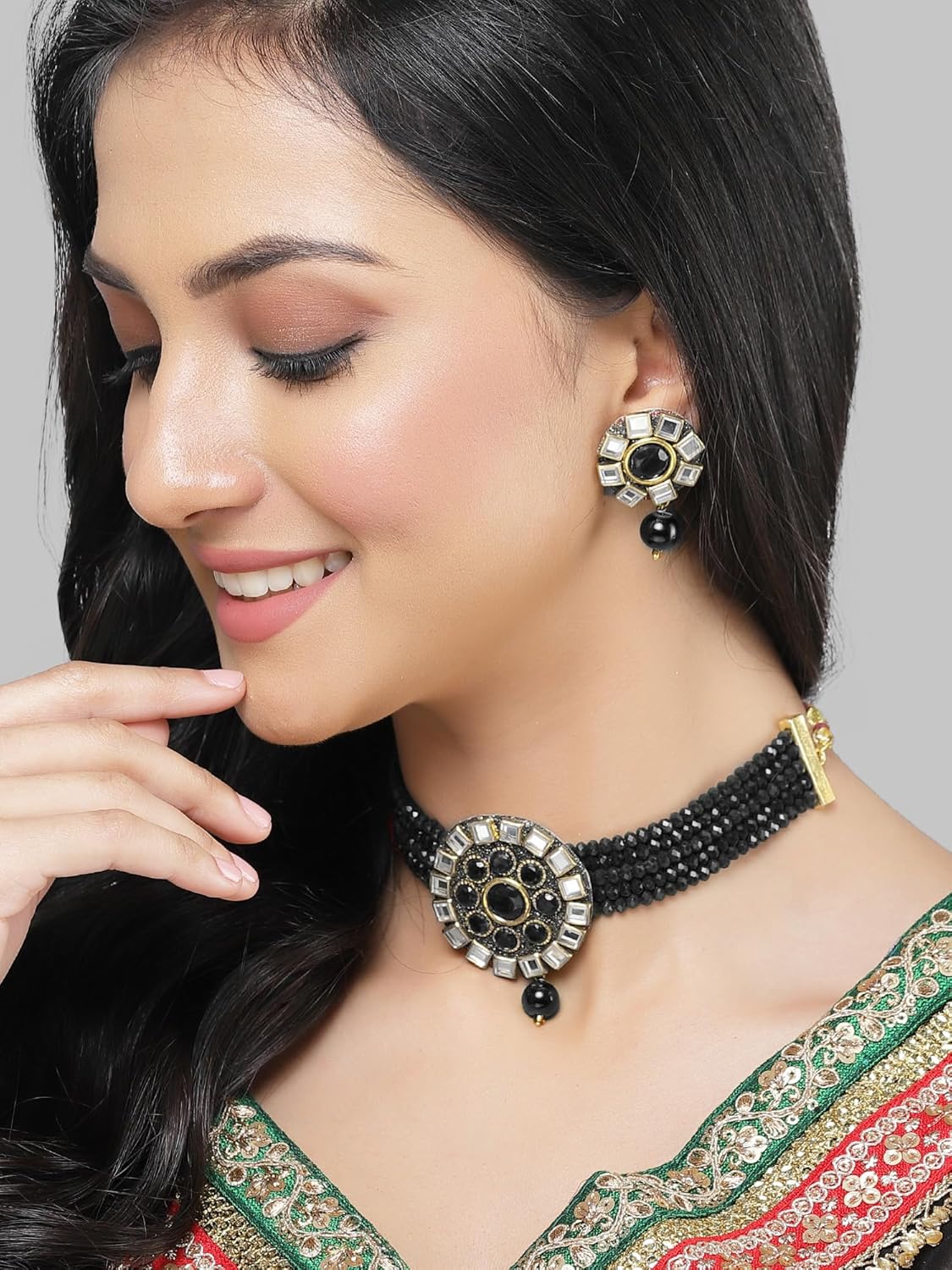 Karatcart Black Crystal Beaded Gold-Plated Choker Necklace Set for Women