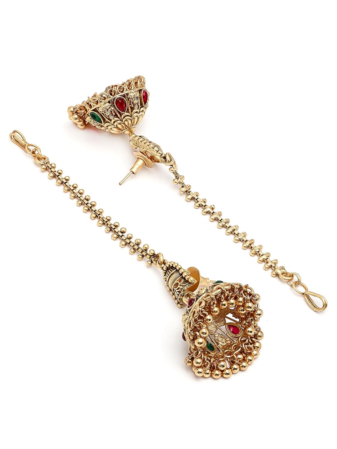 KARATCART Designer Gold-Plated Temple-Inspired Jhumki Earrings with Kaanchain for Women