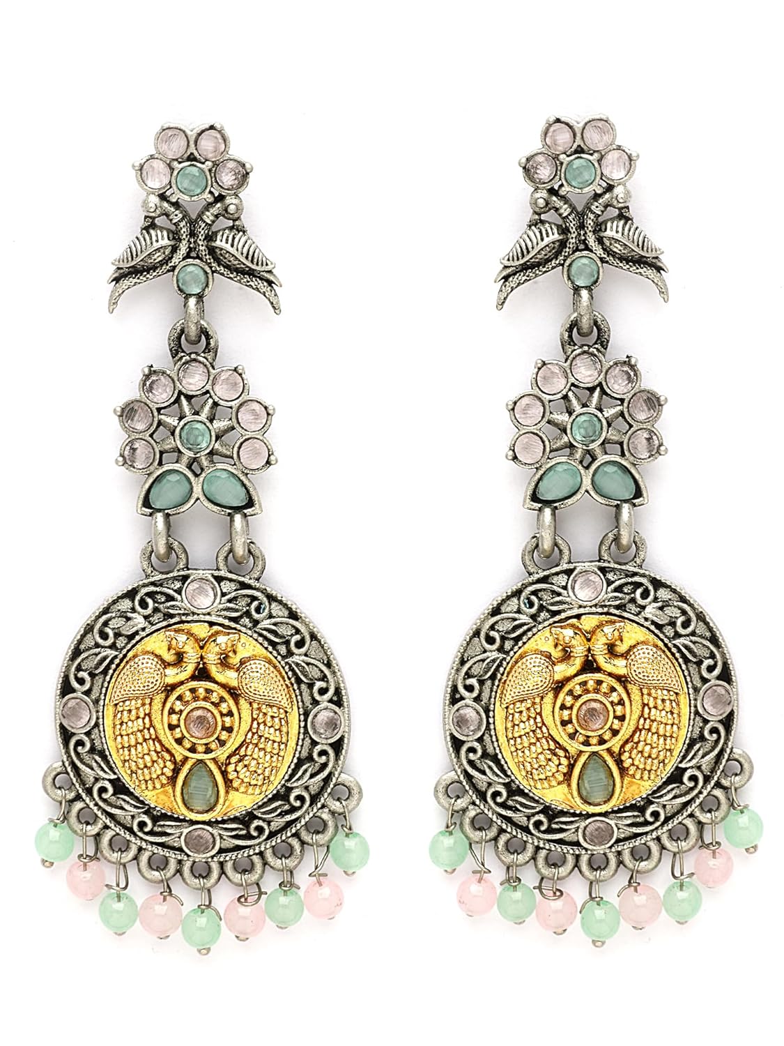 Karatcart Dual-Toned Oxidized Designer Earrings with Peacock Motif, Pastel Stones Danglers for Women