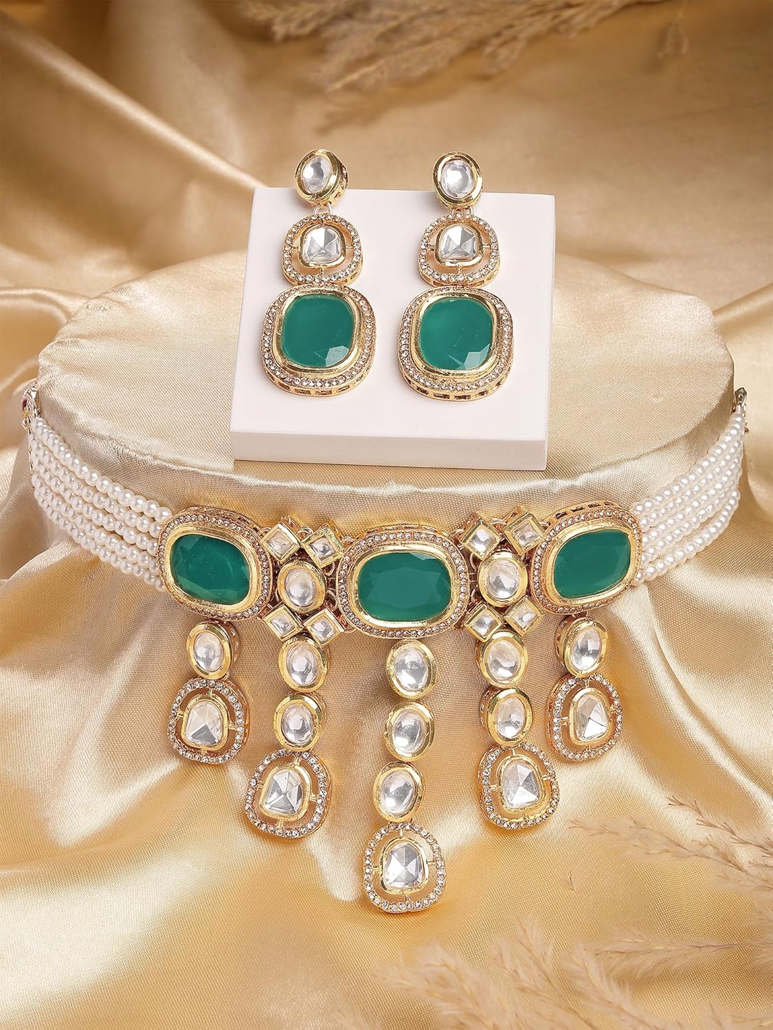 Karatcart Exquisite Green Polki Kundan Choker Jewellery Set with Pearl Strands for Women