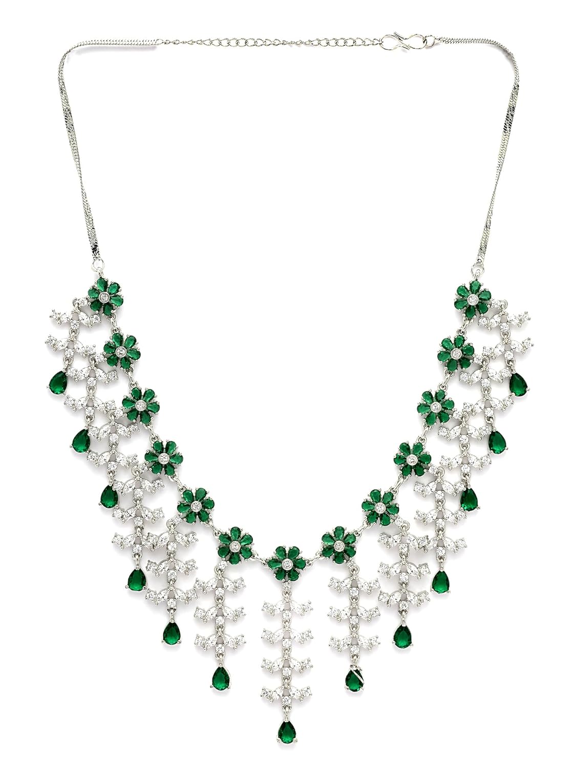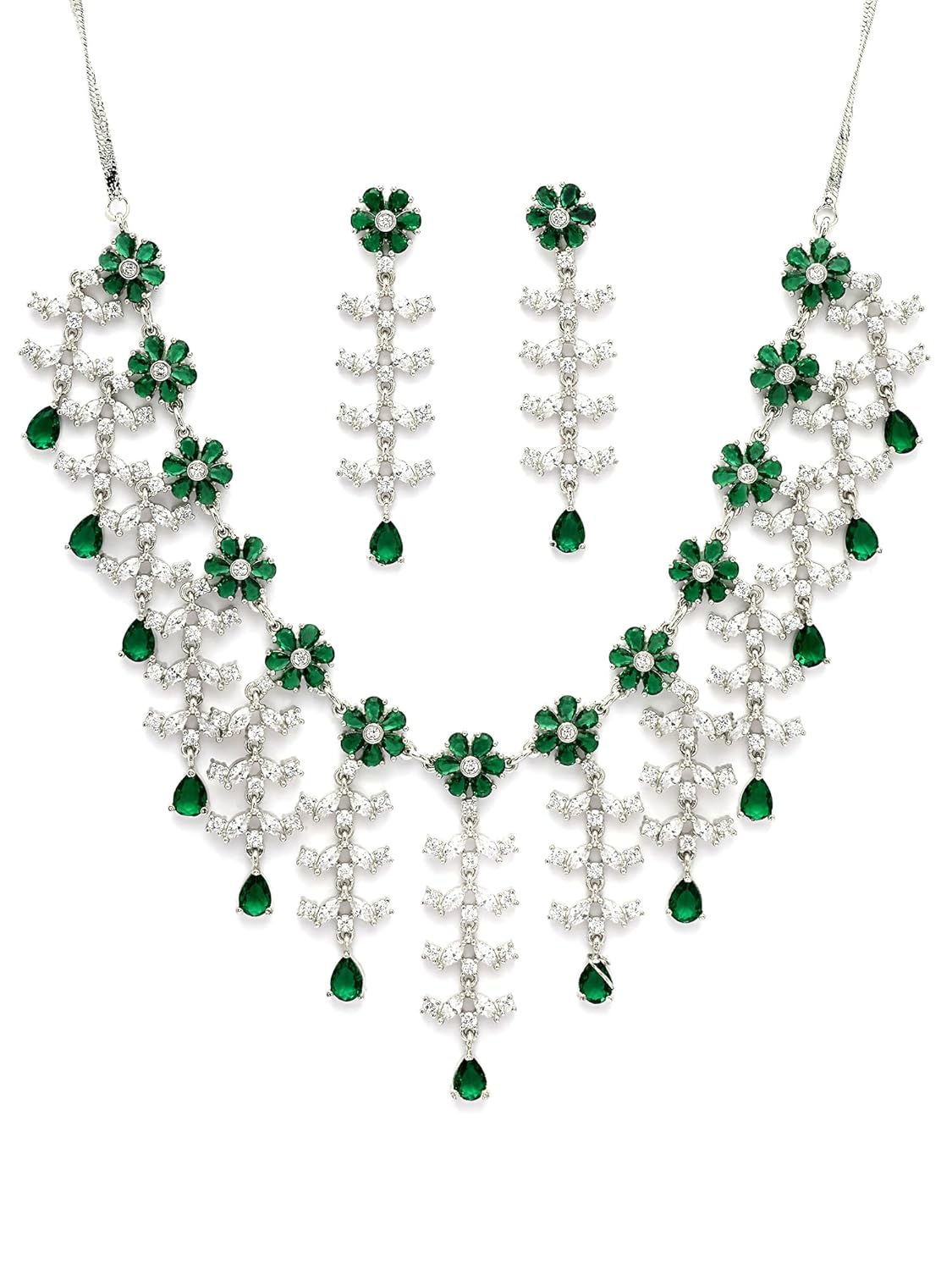 Dazzle in the KARATCART Floral Green American Diamond Silver-Plated Jewellery Set! Instantly elevate your look with these brilliant, classic American Diamonds. The silver-plated finish and vibrant green stones offer timeless elegance for any occasion. Feel confident and stunning. Perfect gift! Limited stock—buy yours today and sparkle!