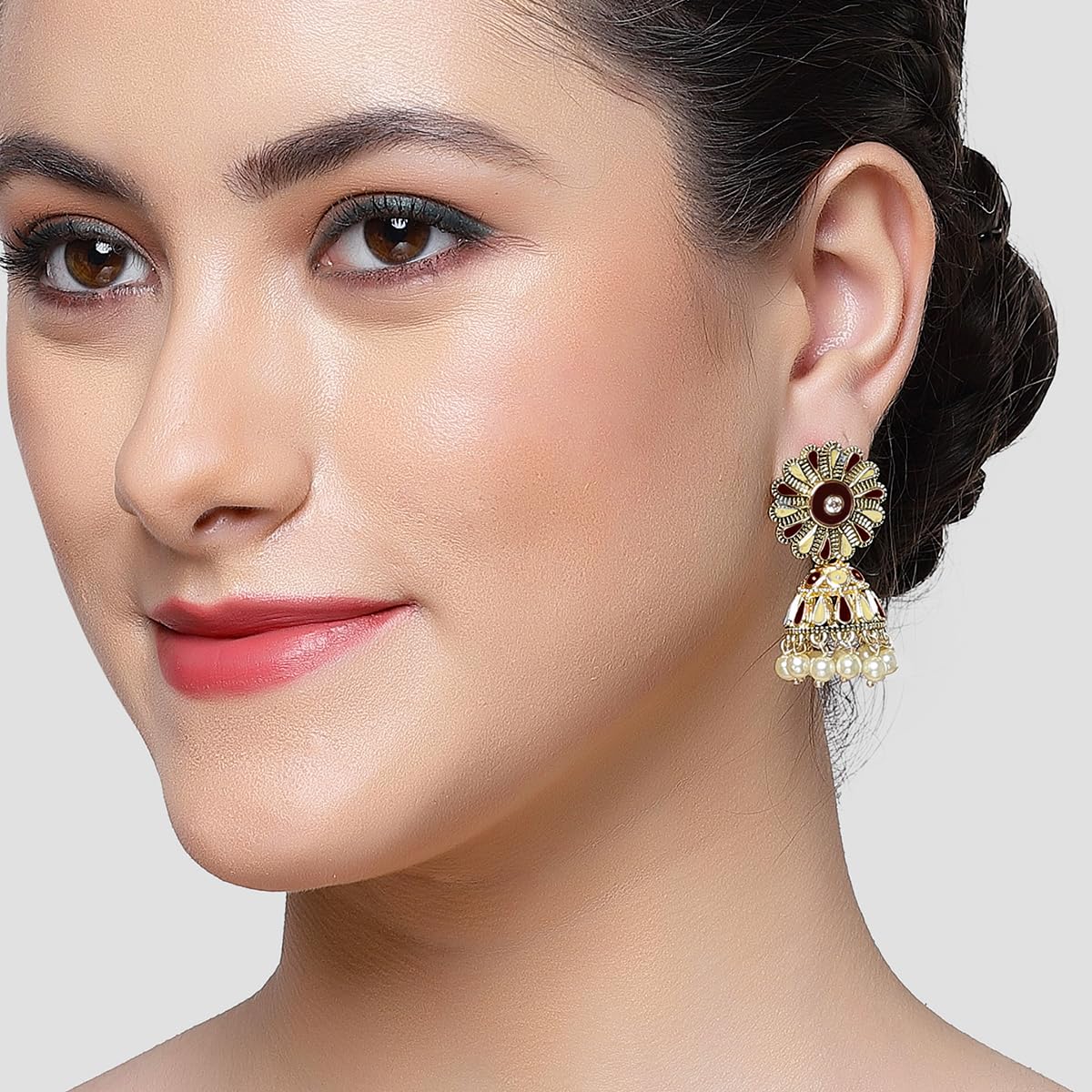Karatcart Gold Plated Floral Design Brown and Cream Meena Jhumki Earrings for Women