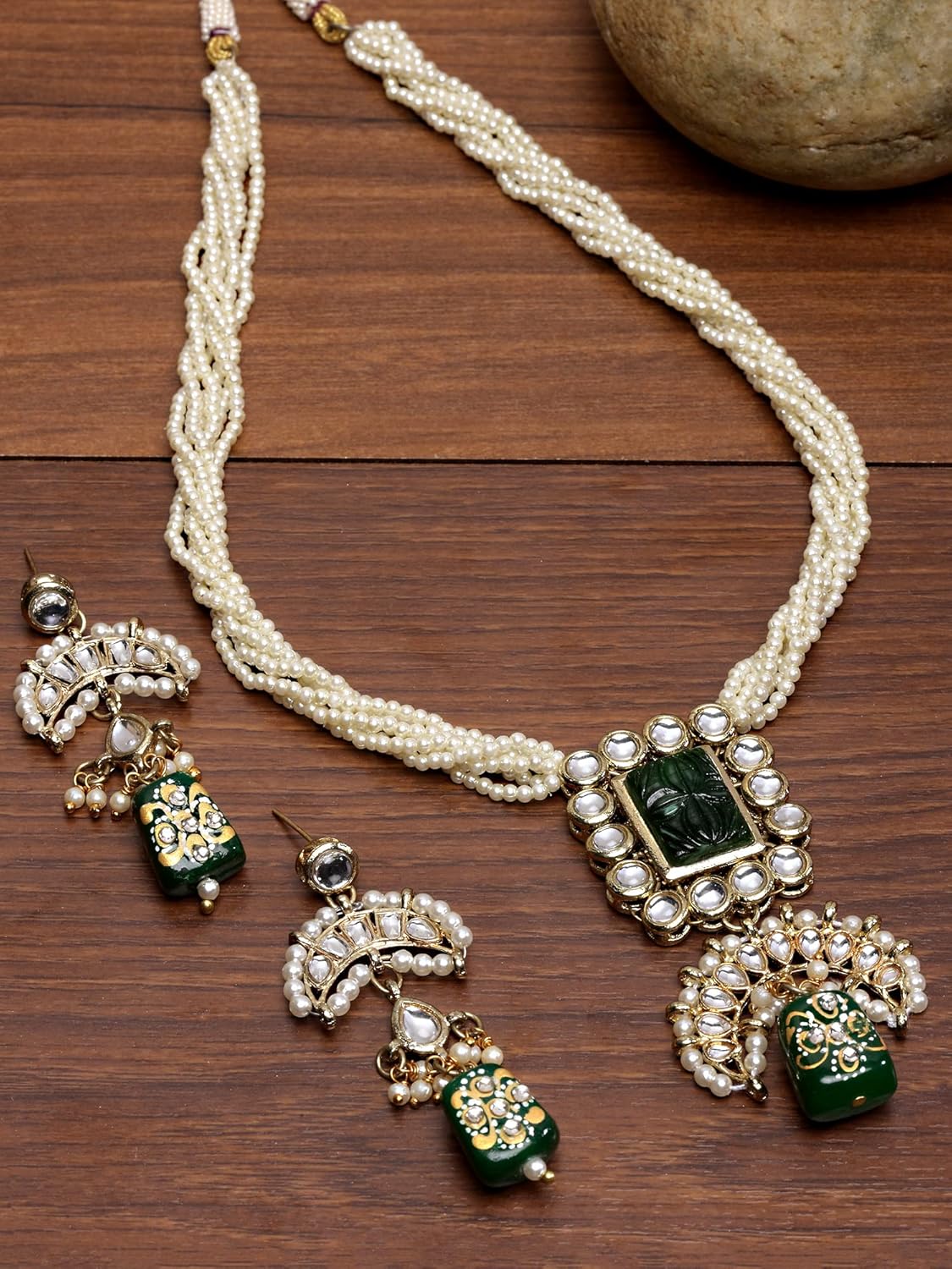 Karatcart Gold Plated Green Carved Stone and Tumble Studded Kundan Rani Haar Necklace Set for Women