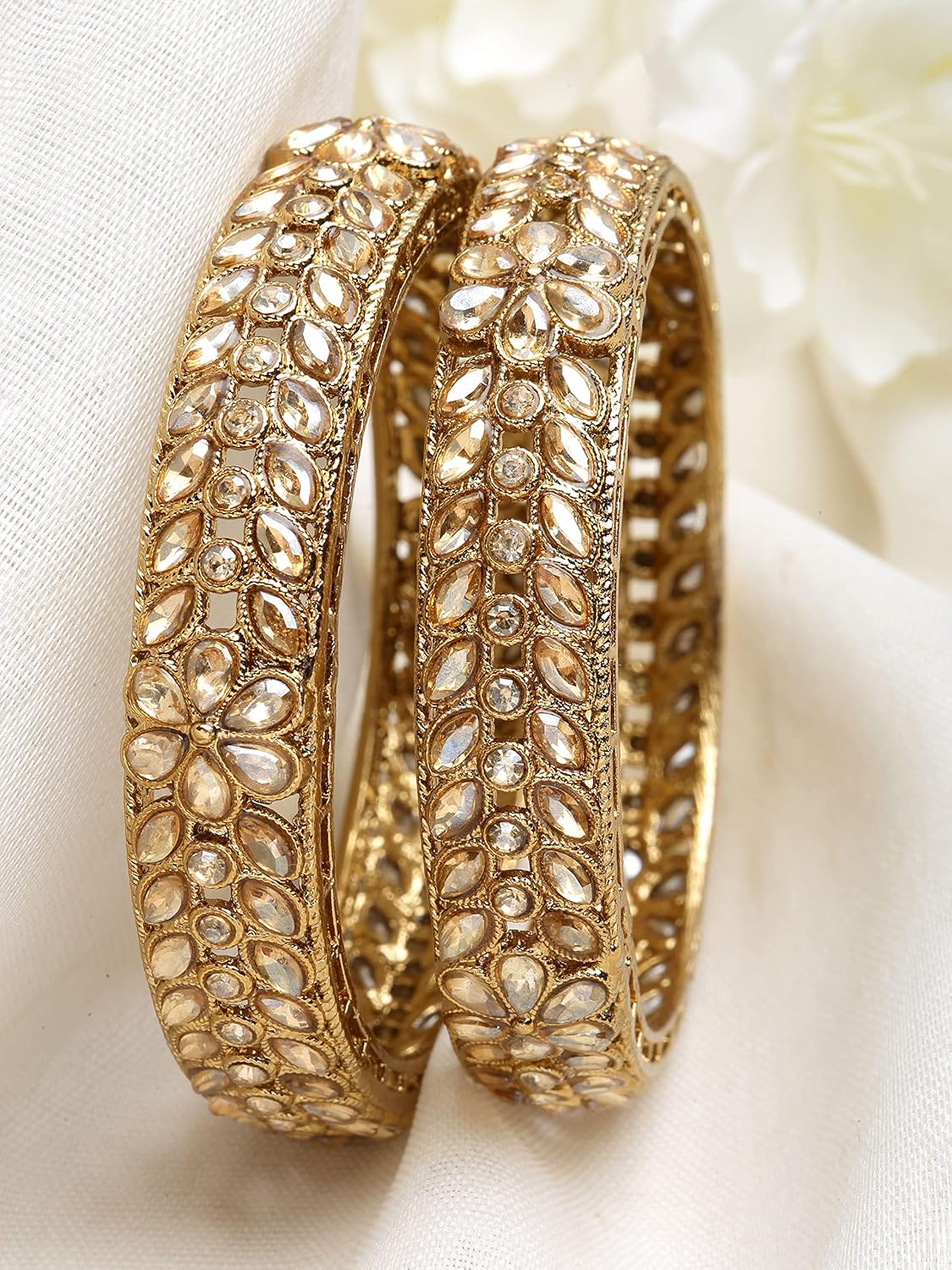 Karatcart Gold Plated Leaf Design Golden Kundan Studded Set of 2 Bangles Set for Women