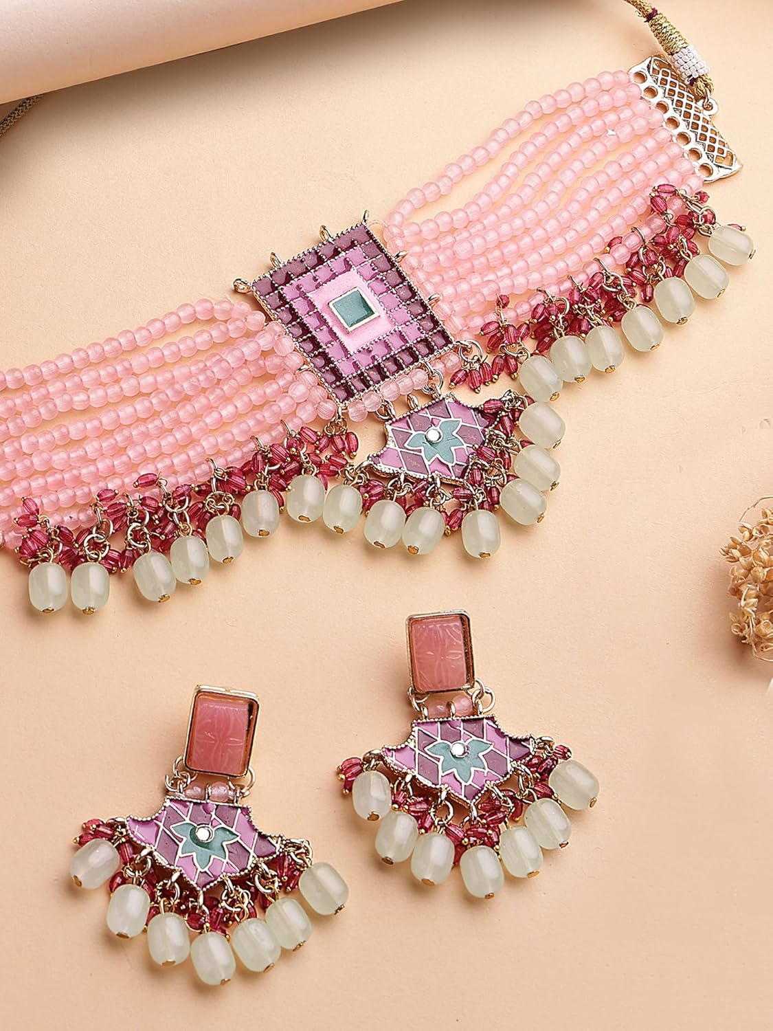 Karatcart Gold-Plated Pink and Lime Green Beaded Meenakari Kundan Choker Necklace Set for Women