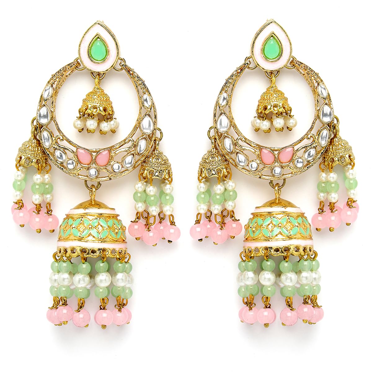 Karatcart Gold Plated Pink and Lime Green Beads Kundan Dangler Jhumki Earrings for Women