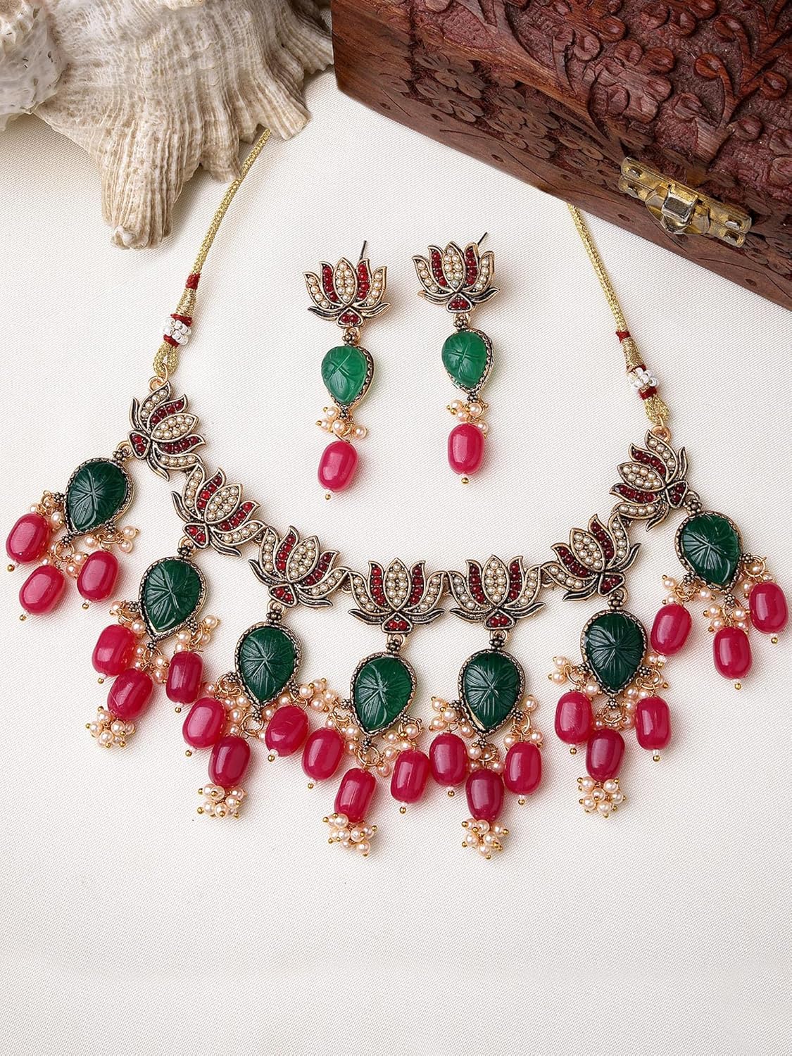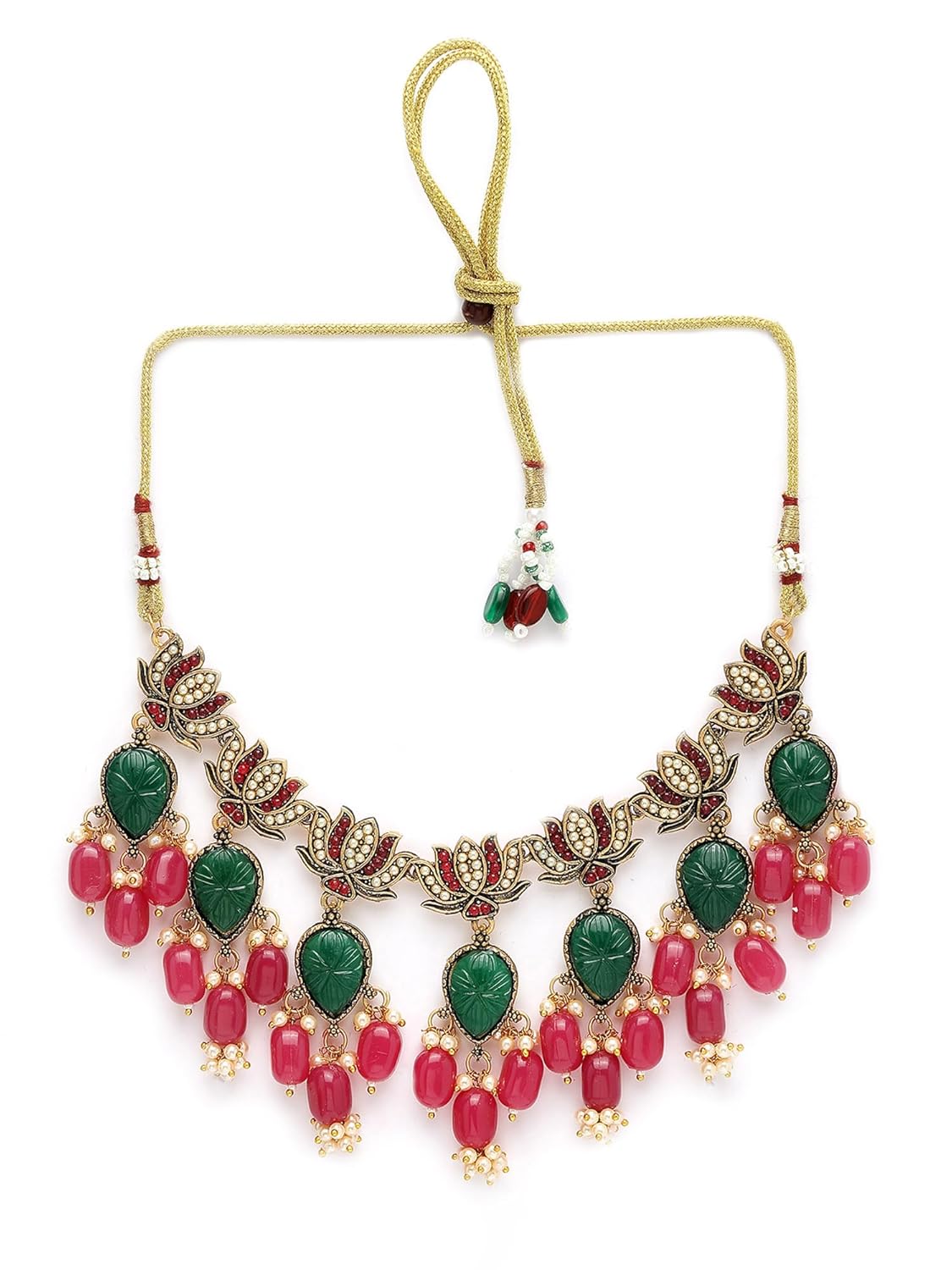 Karatcart Gold Plated Pink Beads Green Carved Stone Lotus Design Choker Necklace Set for Women
