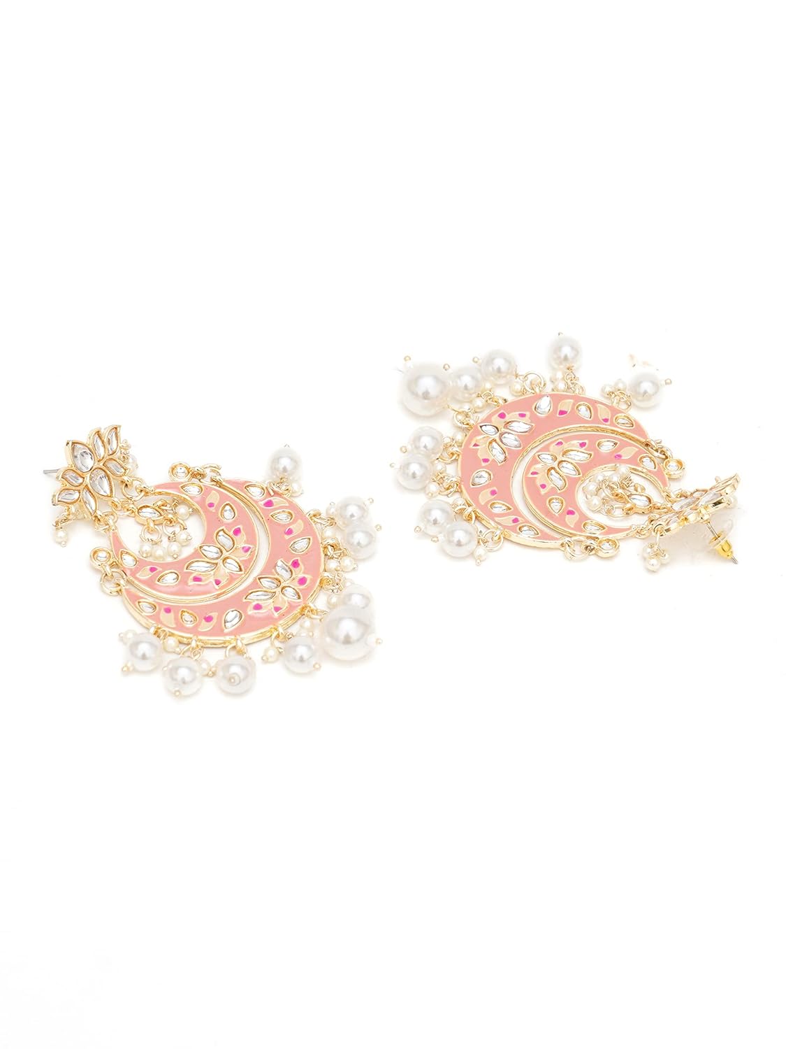 Karatcart Gold Plated Pink Meena Lotus Design Pearl Studded Chandbali Earrings for Women